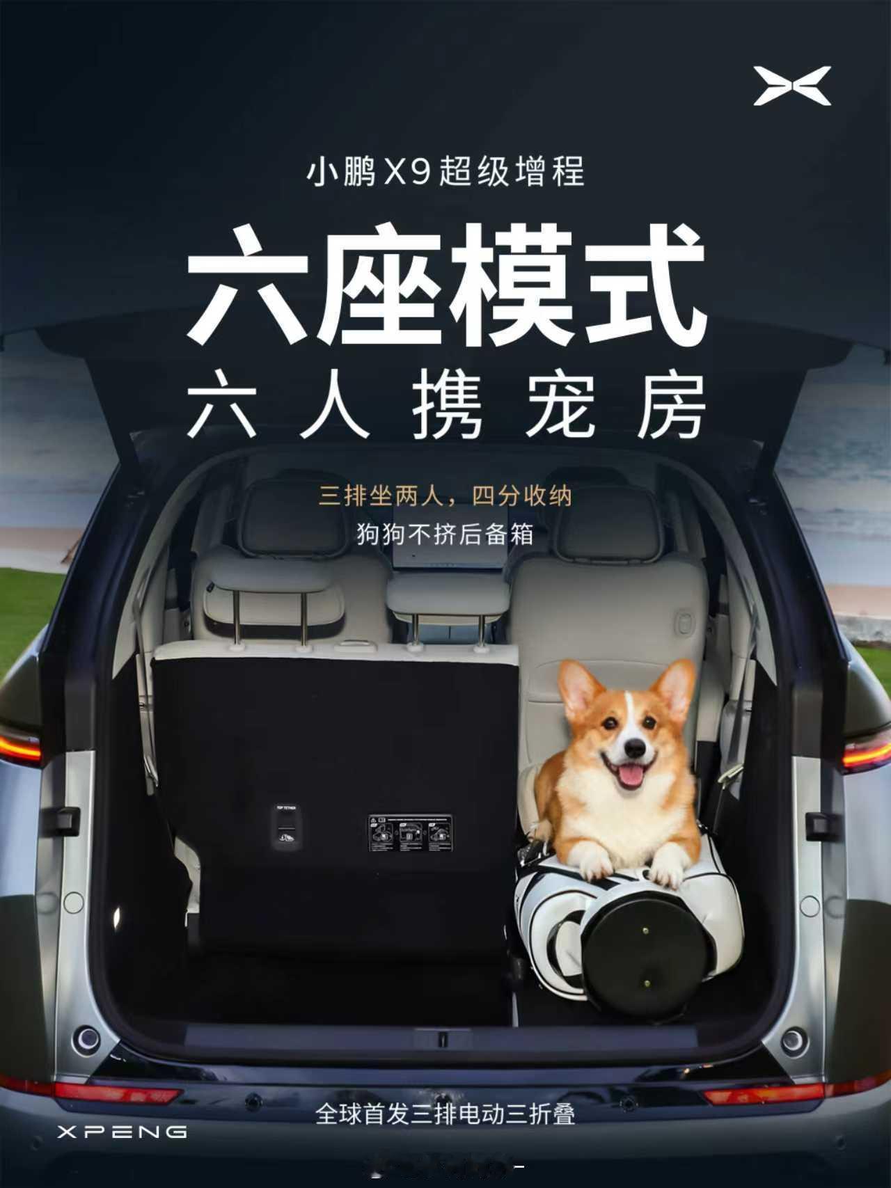 小鹏X9超级增程全球首发电动三折叠,第三排支持四六电动折叠纯平收纳,一键灵活变换布局