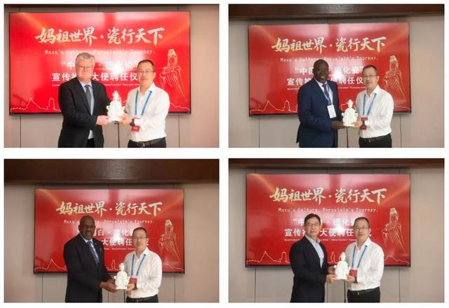德化向拉脱维亚驻华使馆大使卡尔利斯·埃亨包姆斯、南苏丹驻华使馆大使莫里斯·西蒙·巴塔利、博茨瓦纳驻华使馆大使巴特朗·塞雷马、马来西亚驻华使馆公参黄开成及古埙非遗传承人赵亮等颁发聘书,同时精心赠送以妈祖为原型打造的“中国白·德化瓷”艺术珍品。此外,泰国前总理川·立派、泰国驻厦门总领事善善乐等也在妈祖祖庙中庭获颁相关证书。