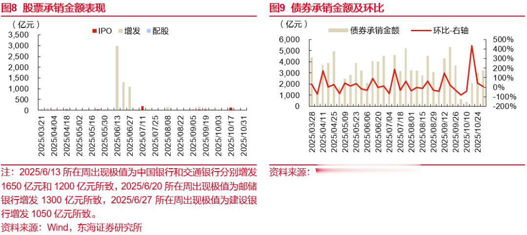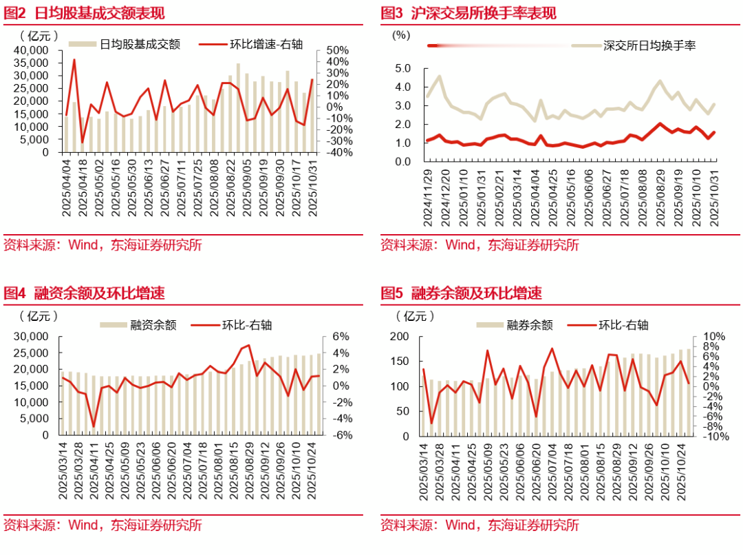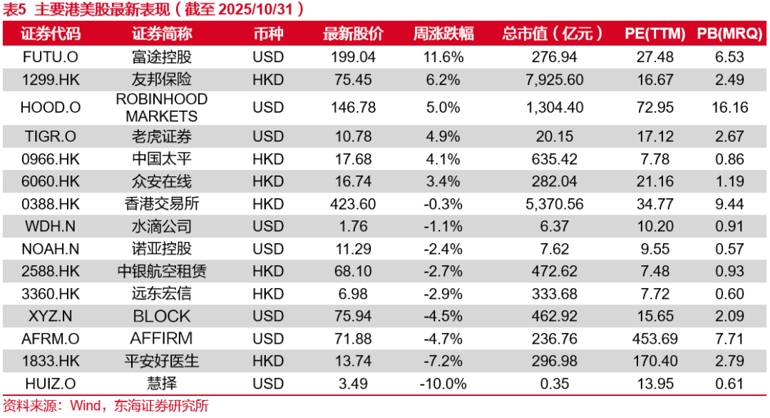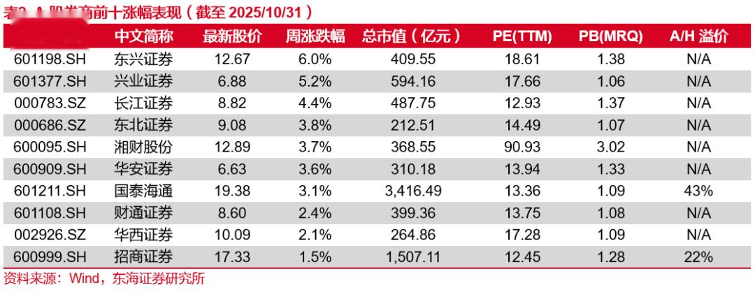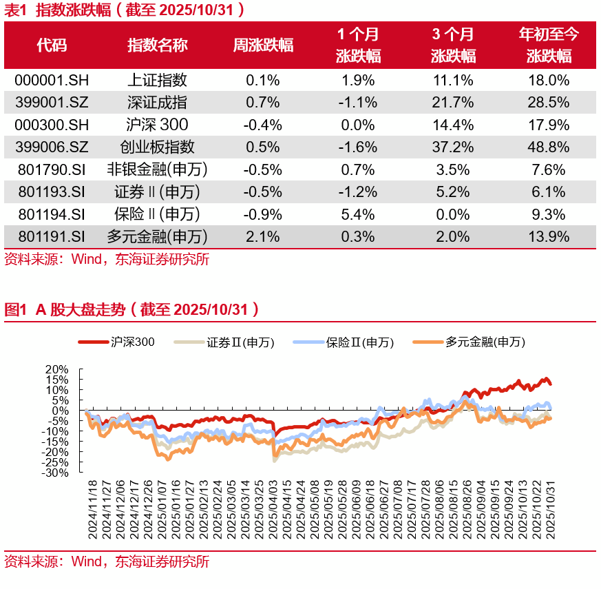 券商:三季报业绩亮眼,金融街论坛明确进一步深化投融资改革,公募业绩比较基准指引征求意见。1)43家上市券商2025年前三季度归母净利润同比增长62%,其中三季度单季增长58%,主要由于市场回暖推动经纪、两融与自营业务收入改善所致,对四季度交投活跃度展望乐观,进而推动券商基本面持续向好。2)2025金融街论坛召开,吴清主席主题演讲明确两大发展方向,一是进一步深化投融资综合改革,纵深推进板块改革,夯实市场稳定内在基础,扩大高水平对外开放,才可以系统性打通“融资端-投资端-市场端”的良性循环,持续增强资本市场的包容性、适应性和吸引力、竞争力;二是大力提升投资者权益保护质效,并于当日发布《关于加强资本市场中小投资者保护的若干意见》,我们认为有望显著提升中小投资者的获得感与安全感,既通过“前端预防、中端化解、末端惩戒”的全链条治理筑牢市场信任基石,也能引导各类资金“愿意来、留得住”,为资本市场高质量发展与金融强国建设注入持久动力。3)证监会上周就《公开募集证券投资基金业绩比较基准指引(征求意见稿)》公开征求意见,一方面明确了基准的选取、变更、信息披露等要求,突出业绩比较基准的表征作用;另一方面对约束作用和评价作用进行强化,加强业绩评价和薪酬考核挂钩力度,推动长期投资能力建设和投资者回报稳定性的增强。