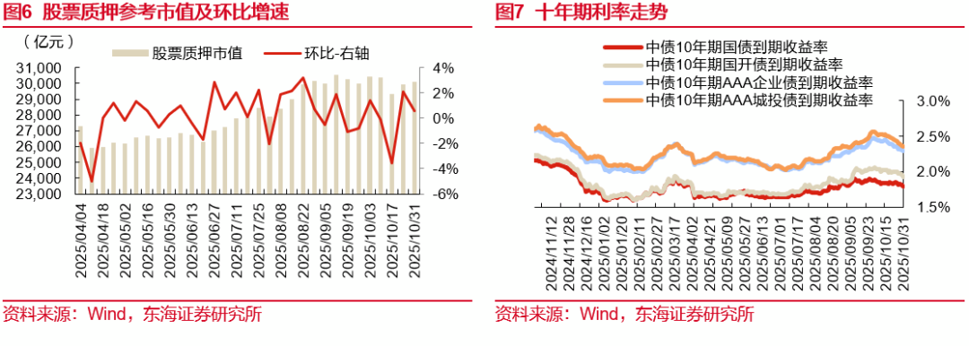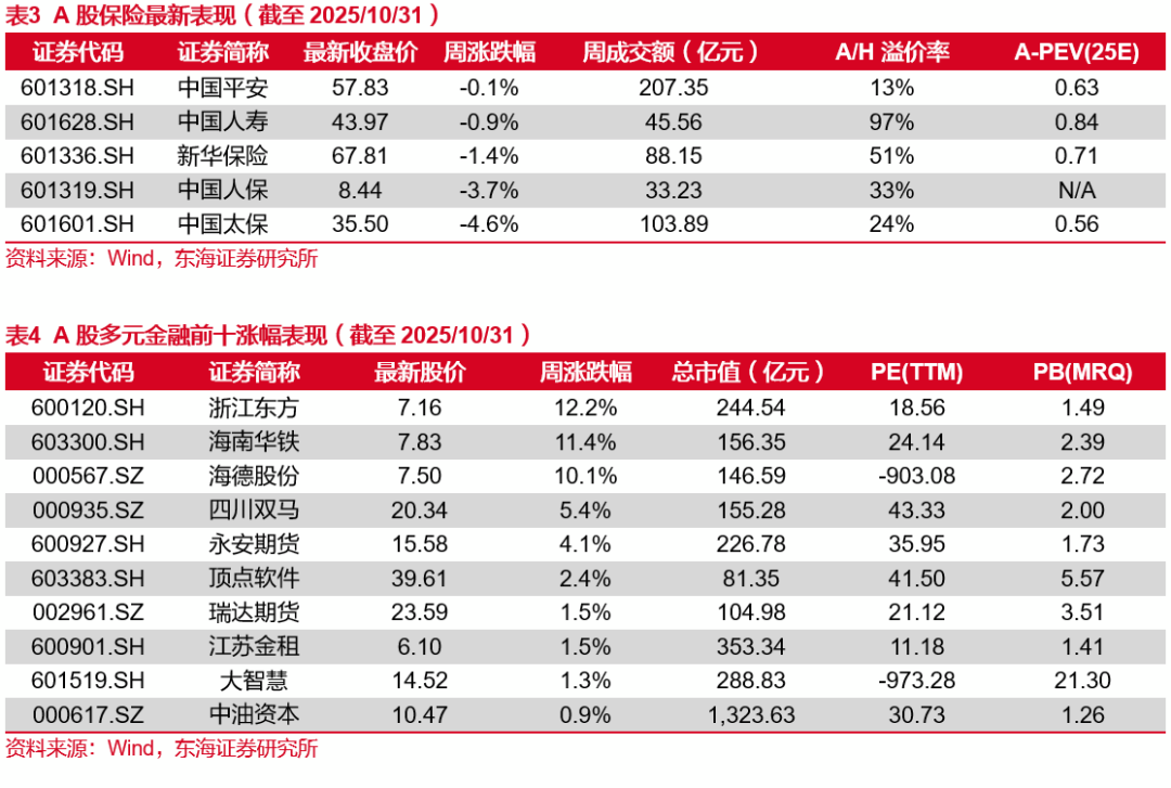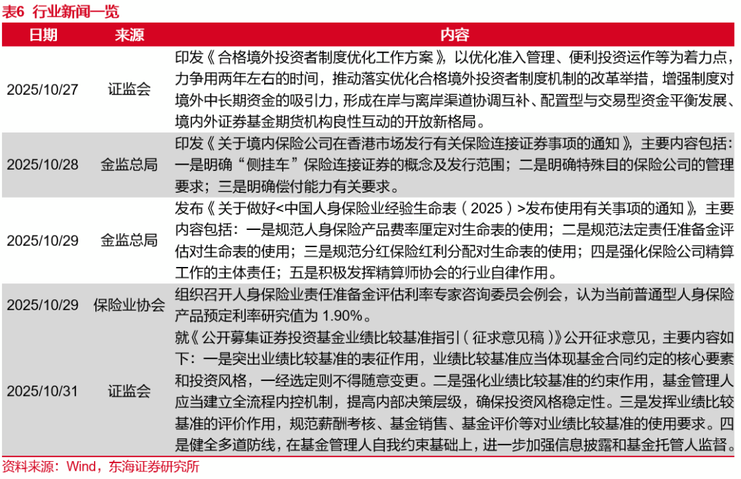 保险:预定利率研究值进一步下调至1.90%,投资端收益提振三季报业绩。1)保险业协会上周公布最新预定利率研究值为1.90%,环比上季度下降9bps,至此已呈现三个季度的逐季下调。虽然研究值的参考指标中,5Y-LPR(2025Q3仍为3.5%)和5Y定存利率(2025Q3仍为1.3%)与二季度保持一致,10Y国债收益率2025Q3上行21bps,但作为核心约束指标的基础回报水平中,10年期国债到期收益率仍需考虑250日和750日移动平均的影响。考虑到长债利率趋势下行,对研究值形成一定的下行压力,但现阶段利率中枢已处于区间震荡阶段,预计后续研究值降幅将进一步收窄。此外,考虑到9月预定利率已下调至2.0%,我们判断短时间不会触及新的调整阈值,夯实了产品设计的持续性和稳定性基础。2)5家A股上市险企2025年前三季度归母净利润同比增幅达33.5%,其中三季度单季同比增速高达64.3%,主要系市场情绪升温下的投资端收益大幅提振所致。此外,负债端保单销售火爆推动NBV高增,预定利率调整下的NBV增长基础进一步夯实。虽然短期有所调整,但低估值优势仍在,重点关注年末风格切换下的配置价值。