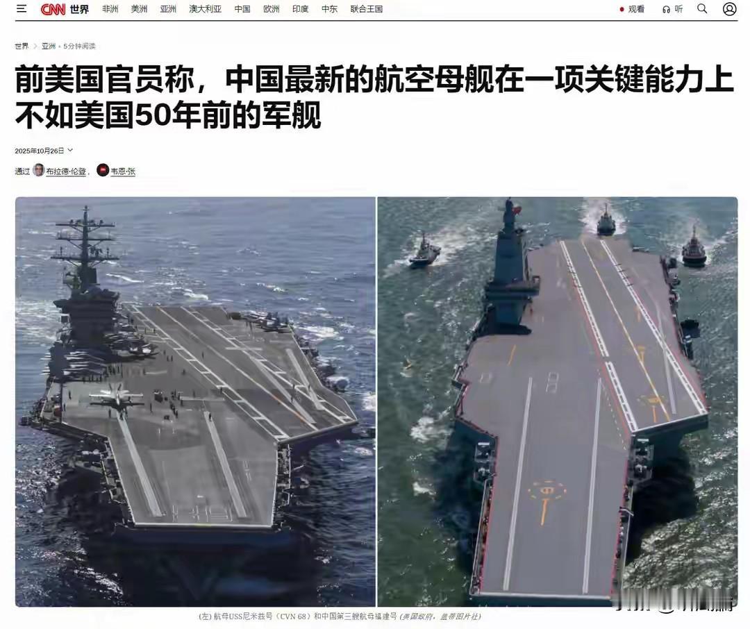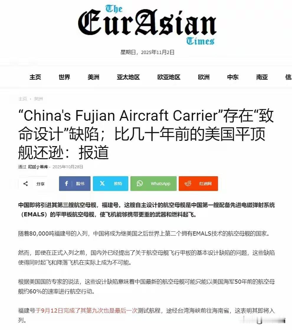 印媒说福建舰设计有毛病?咱掰扯掰扯咋回事 印度《欧亚时报》10月份引用美国CNN的报道,说咱福建舰甲板调度不灵光,舰载机出动效率只有美国50年前尼米兹号的六成。这话源头是美国前海军上尉卡罗尔·舒斯特的分析,咱得认:福建舰的二号弹射器挡焰板确实有点挡斜角降落甲板,舰载机降落时这弹射器就得停用。 福建舰最初是按蒸汽弹射设计的,斜角甲板和中轴线夹角定的是6度(尼米兹是9度)。蒸汽弹射轨道短(约85米),这角度刚好合适。但2017年前后,咱电磁弹射技术突飞猛进,测试发现比蒸汽弹射强得多,于是果断改方案。可电磁弹射轨道长(110米以上),原设计下二号弹射器就侵入了降落区。 军方评估过,九成海战场景下采用“波次出动”,起降分开作业,影响不大。极端情况下效率损失约7%,但比起推迟服役,这代价能接受。再说,福建舰电弹确实争气——今年9月22日公开视频里,歼-15T、歼-35、KJ-600都弹射成功,而美国福特号至今弹不了F-35C。 特朗普今年10月28日在日本放话,想将福特级后续舰改回蒸汽弹射。为啥?福特号电弹平均240次就故障一回,F-35C还弹不了,维修得找MIT专家。更麻烦的是,美国蒸弹厂家早破产了,改回去怕是连设备都凑不齐。 福建舰这设计算权衡之选,小毛病后续舰好改。而美国卡在技术青黄不接的坎儿上,这才是真头疼。福建舰 福建号航母 舰载机弹射技术 福建舰舰 航母原理 福建号舰 福建号试航