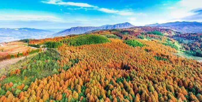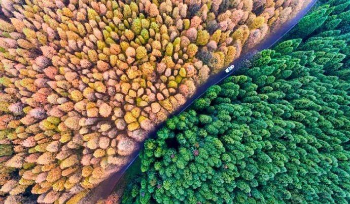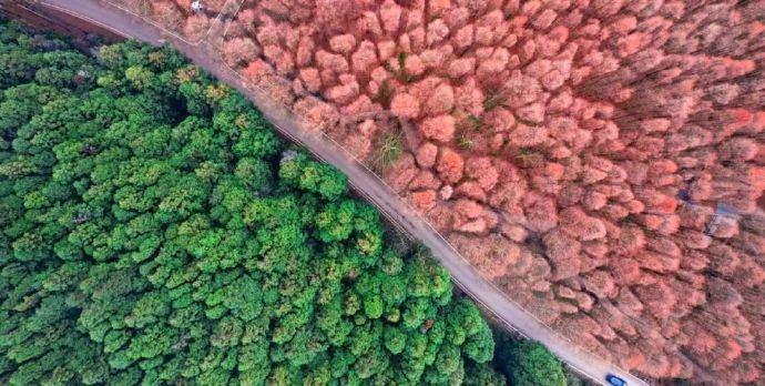 当秋意掠过山王坪 这里便成了大自然最得意的调色板 10月底至11月底 是山王坪一年中最绚烂的时刻 上万亩水杉林和柳杉林 在秋霜的轻抚下 呈现出“一半春天一半秋天”的奇观 红色的水杉与翠绿的柳杉 一路之隔 泾渭分明 宛如两个季节在同一时空交汇(素材