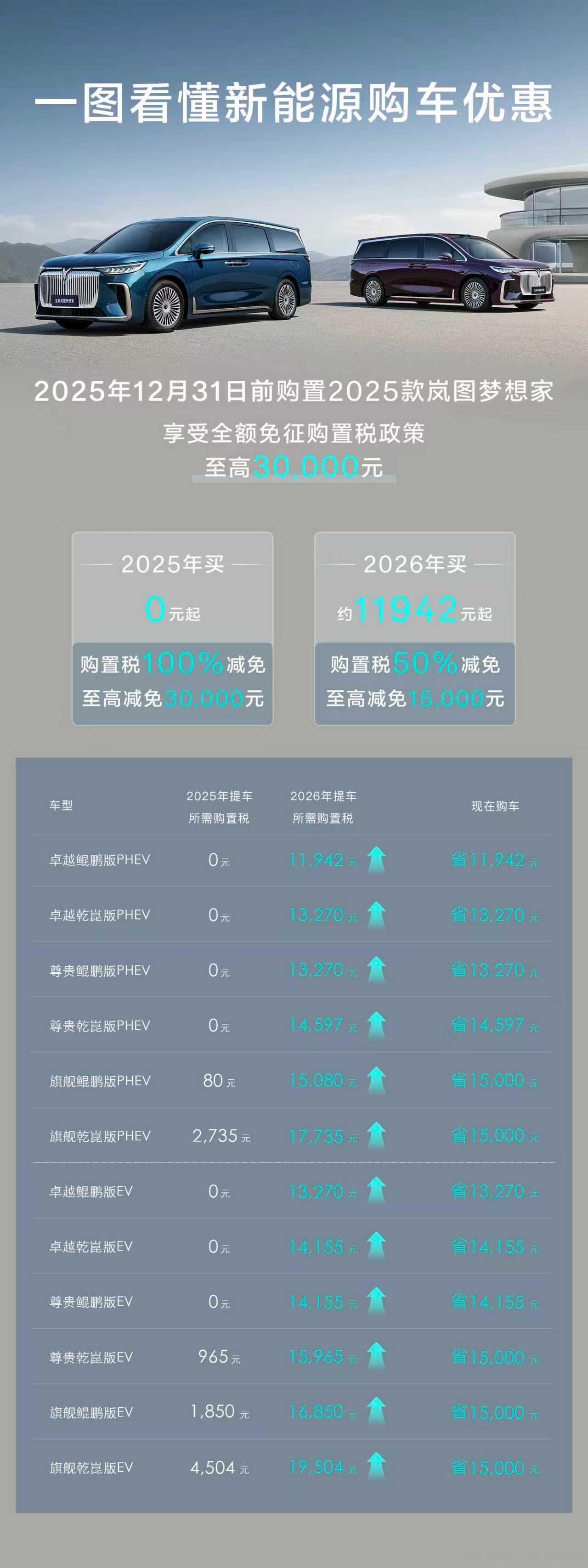 看到就赶紧行动吧!岚图梦想家2025年全免购置税活动已经进入倒计时,现在入手梦想家的人真是太聪明了,能省下一大笔钱用来买新包包、新手表,多划算啊!别等到活动结束了再后悔哦!具体详情请看图!