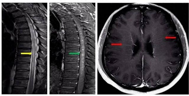 万分焦虑之下,陈老师慕名找到了南京市第一医院神经内科主任医师、医学博士时建铨,在仔细梳理了陈老师病情后,时建铨认为对称性下肢无力、上肢感觉异常及排尿功能障碍这三个症状看似互不相关,但串联在一起则指向了同一个方向,可能存在脊髓方面问题。时建铨给陈老师安排了脊髓+头颅增强核磁共振检查,结果提示:脊髓长节段异常信号(图1中黄色箭头)伴斑片状强化(图1中绿色箭头),且脑室周围存在线样放射状强化(图1中红色箭头)。