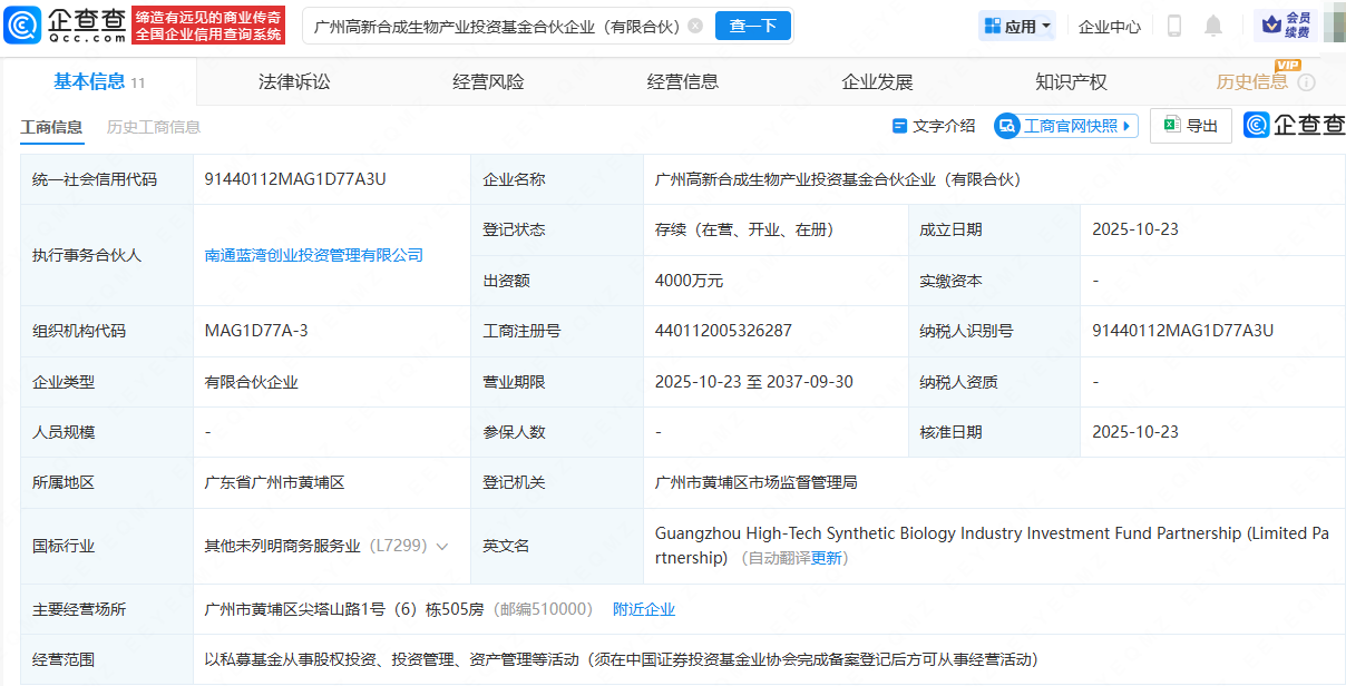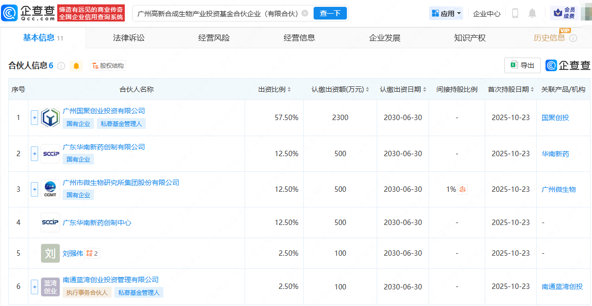 企查查APP显示,近日,广州高新合成生物产业投资基金合伙企业(有限合伙)成立,出资额4000万元,经营范围包含:以私募基金从事股权投资、投资管理、资产管理等活动。企查查股权穿透显示,该合伙企业由广州国聚创业投资有限公司、广东华南新药创制有限公司等共同持股。
