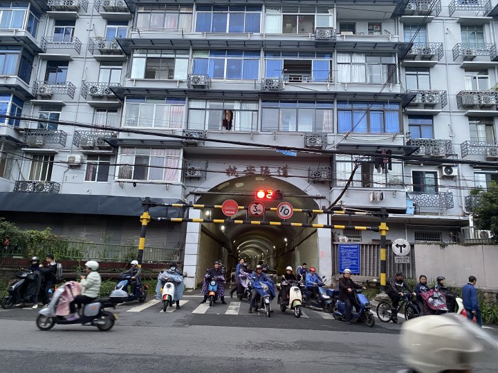 随着下班临近,隧道开始忙碌许多,很多职工骑着电动车从隧道进出。