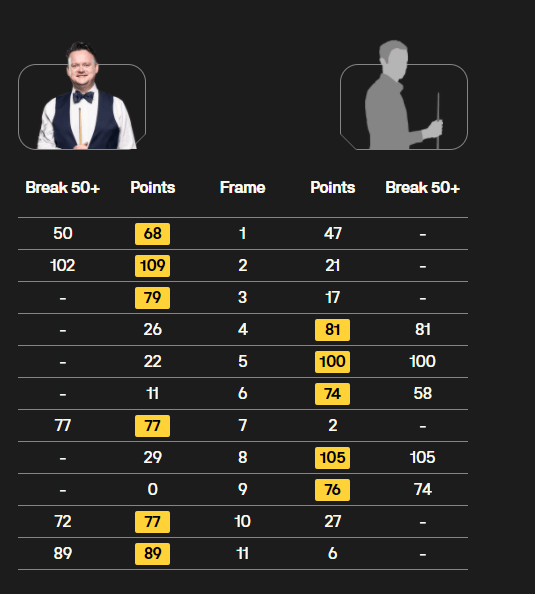 全场比赛,王信仲打出两杆破百(100、105)和三杆50+(81、58、74),肖恩-墨菲打出一杆破百(102)和四杆50+(50、77、78、89)。