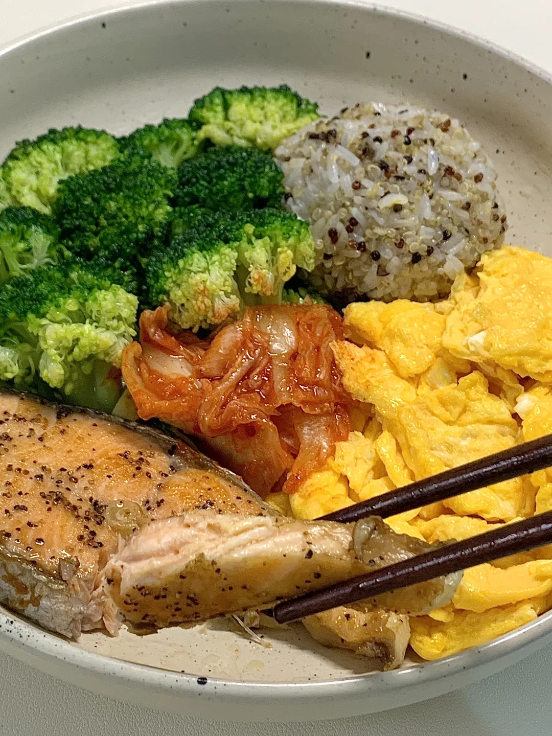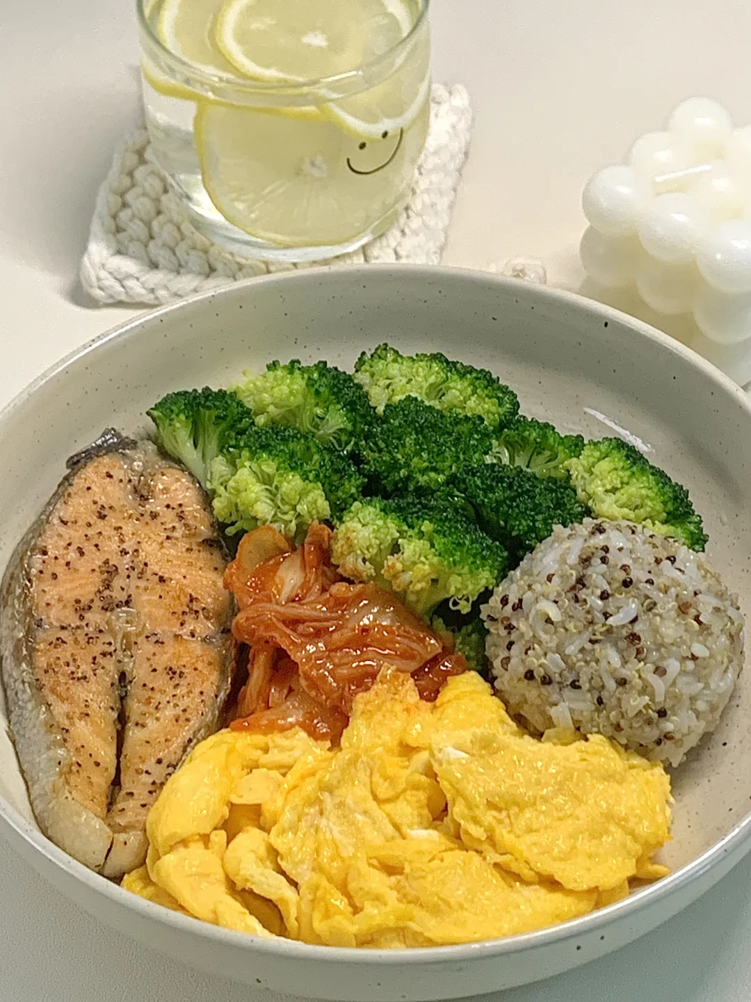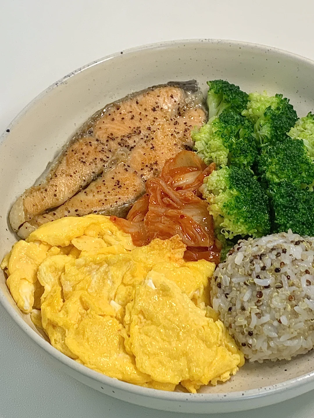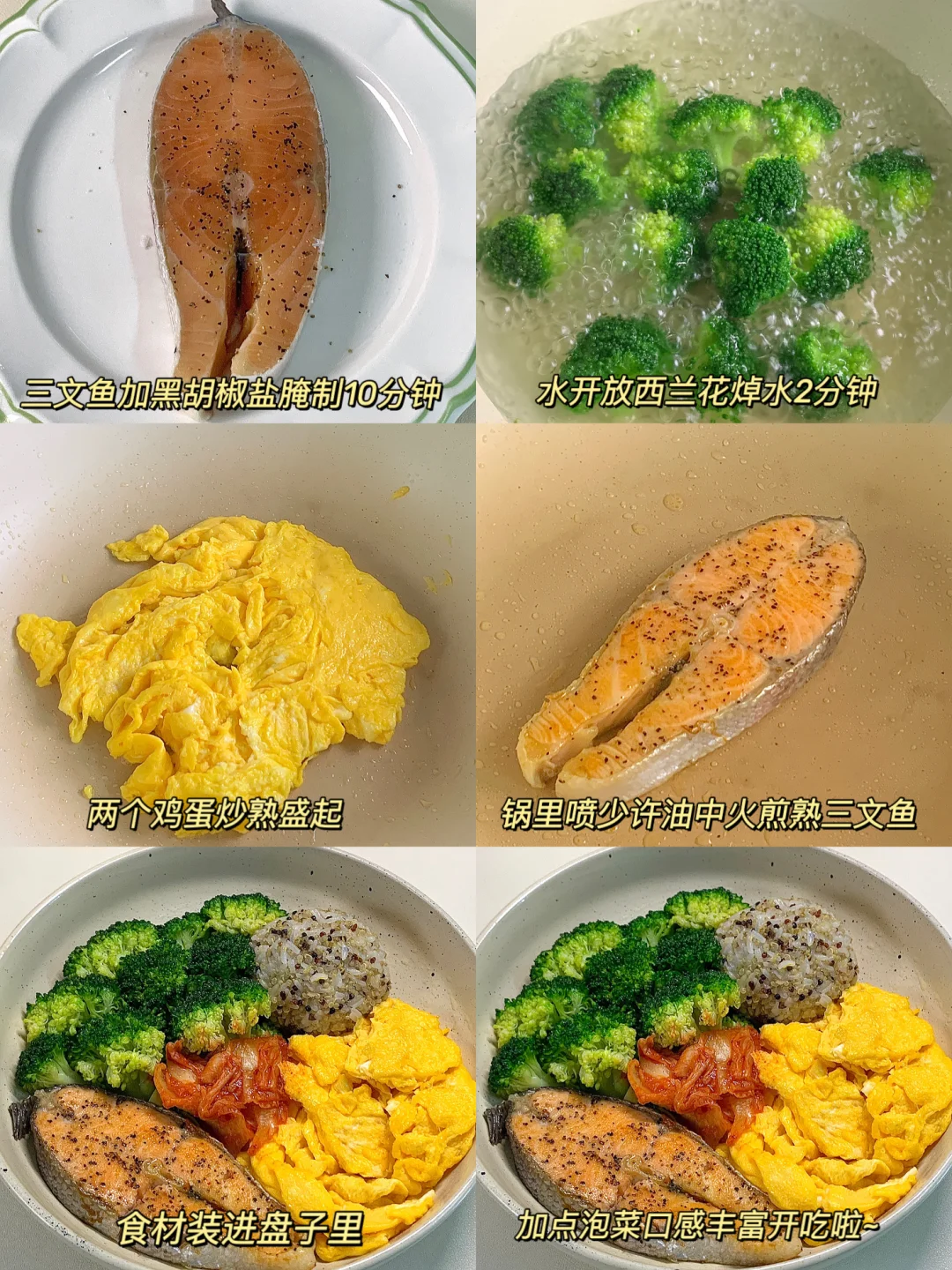 一人食吃什么 今天晚餐长这样 香煎三文鱼配上滑蛋黎麦饭,真的巨好吃,毫不夸张连吃一周,相信我快去吃,做法简单又美味,高蛋白又低卡👇 🥦食材:三文鱼一块丨鸡蛋两个丨西兰花丨一点泡菜丨一拳头黎麦饭 🫕做法步骤在图4️⃣
