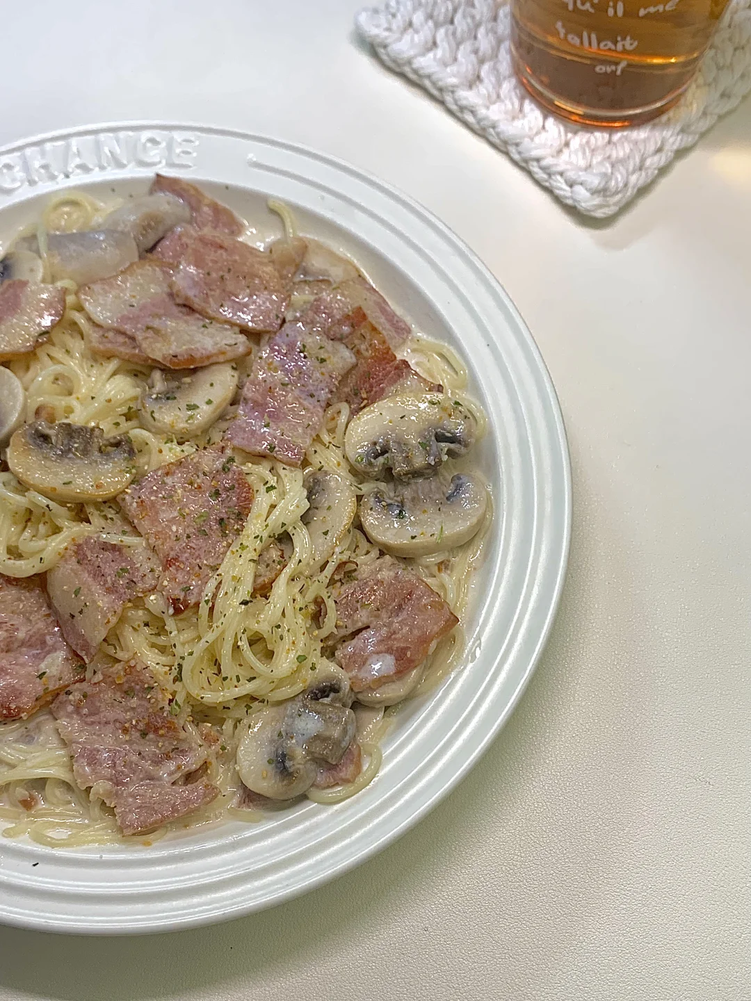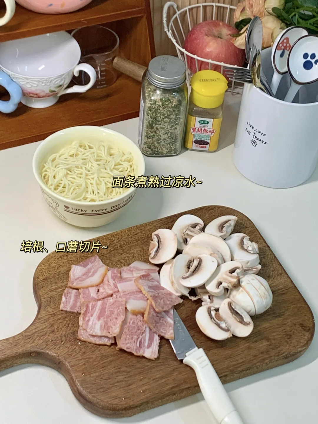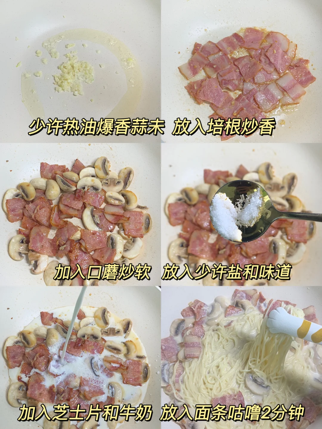 💕哈喽~小伙伴们我来啦! 今日份做了低卡版蒜香奶油意面~ 不夸张!奶香、蒜香都巨浓郁! 📝一起来看看做法叭~ .面条先煮熟过凉、培根🥓口蘑切片 .锅里放少许油爆香蒜未 .放入培根炒香加入口蘑炒软 .放适量盐和味精黑胡椒 .加入牛奶和芝士片煮开 .加入意面咕噜咕噜好香呀~ .出锅啦!