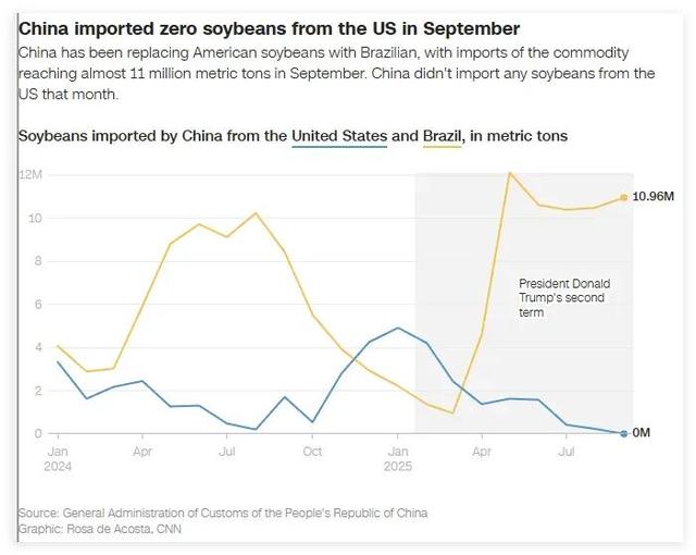 CNN呈现的第三张图表和第四张图表,则是中国进口美国大豆和牛肉的情况,统计范围是去年1月至今年9月。这两张图表的共性是,中国很快就找到了替代美国相关农产品的来源,比如巴西、澳大利亚以及阿根廷。