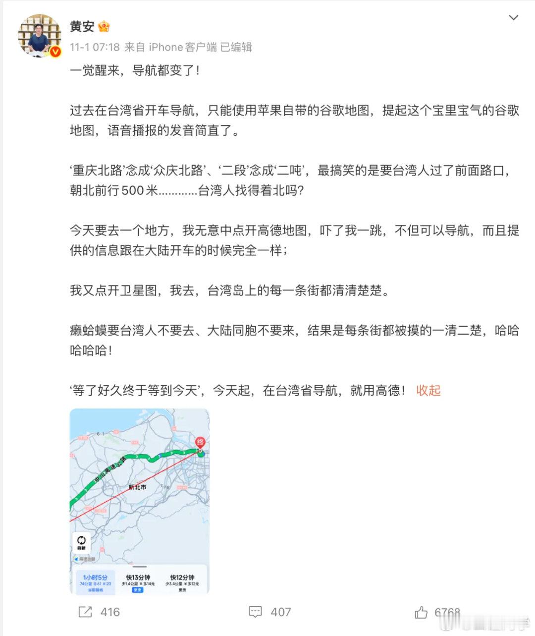 台湾省可以用高德导航了这进度够快的,高德快人一步啊!刚才刷热搜看好多网友再说高德