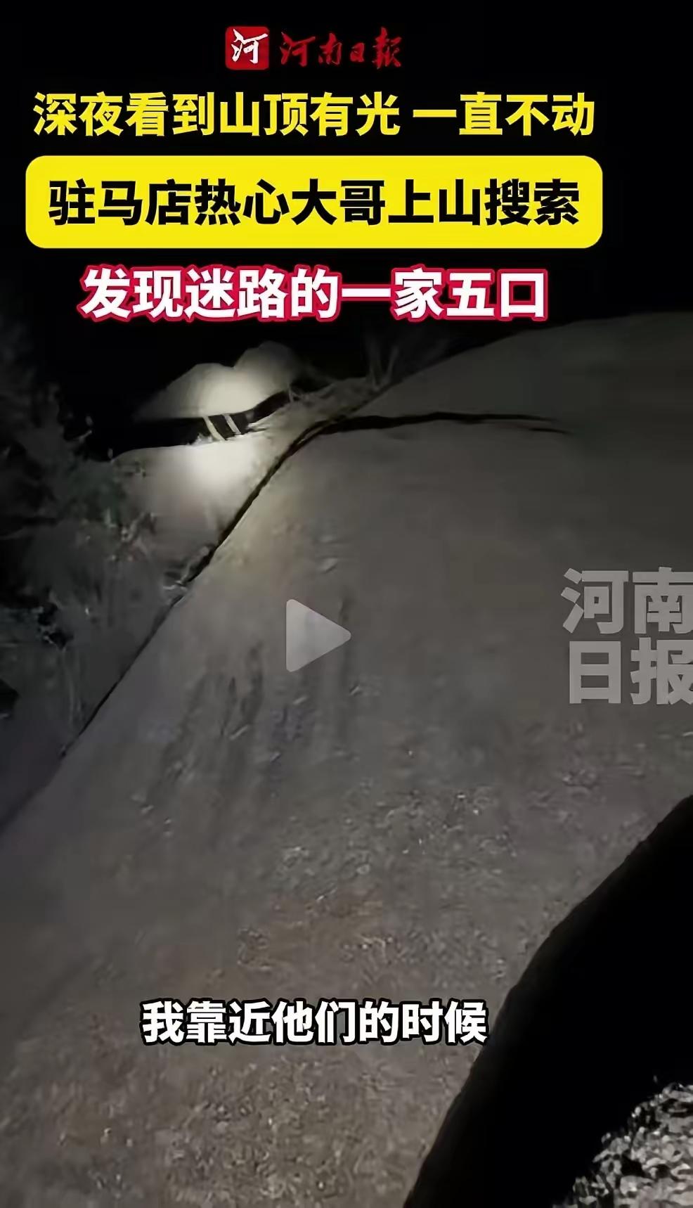 河南驻马店,男子深夜看到山顶有光一直不动,于是上山搜索,结果发现迷路的一家五口!网友:一般人即使知道看到有光,也不会想到会有人被困。大哥不仅想到了,而且做出了行动!真是好样的! 李大哥住在山脚下。这天深夜,万籁俱寂,李大哥却睡不着,去院子里抽烟。山里神秘现象 深山夜间迷路 夜间寻山 天黑被困山顶 夜间密林 就在那一刻,李大哥的眼睛被远处山顶那一抹微弱的光晃了一下。或许是月光折射,也可能是某种奇异的反光,但那光一直在那里,没有任何变化。平时的他,或许会选择忽略,继续沉浸在自己的夜色中,但这次不同。那一瞬间,他的心跳突然加快,直觉告诉他:有人需要帮助。 他没有多想,立刻起身,披上外套,拿起手电筒,踏上了那条熟悉而又陌生的山路。夜色中,山林的静谧令人心生敬畏,但李大哥的心中只有一个念头:有人在那儿,可能已经等了很久。 沿途的黑暗似乎在考验他的意志,每走一步都像是在和自己内心的恐惧作战。山路崎岖,树枝划过脸颊,寒风刺骨,但他的心比任何困难都要坚强。终于,他在山顶发现了那一抹微光——竟然是一家五口被困在山上的一处小空地,脸色苍白,惊魂未定。 这不仅仅是一场普通的夜间救援,更是一场人性光辉的体现。李大哥的善良和勇气,让人忍不住想问:在这个快节奏、冷漠的社会,为什么像他这样的人还那么少?为什么很多人看到有人困在山里,却选择视而不见?也许,正是因为有像李大哥这样的人存在,才让我们相信,善良还没有被这个世界彻底埋没。 网友们纷纷点赞:大哥不仅看到了光,更看到了生命的价值。有人说:“一般人看到光,可能只会觉得是灯光、闪烁的反光,绝不会想到有人会被困。”但李大哥用行动证明了:只要你有一颗善良的心,就能在黑暗中找到光,照亮别人,也照亮自己。 这件事让我们反思:在这个充满诱惑和冷漠的时代,谁还愿意停下脚步,去关心身边的陌生人?谁还能在危难时刻挺身而出,成为别人的“光”?也许我们都需要一场“夜晚的考验”,让自己变得更有温度,更有责任感。 故事还在继续,善良的种子在每个人心中萌芽。或许,你我都可以成为那个“李大哥”,在别人最需要的时候,伸出援手。因为,真正的勇气,不是没有恐惧,而是在恐惧中依然选择去行动。让我们为那些默默守护、用行动点亮他人生命的人点赞,也希望更多人能从中汲取力量,成为这个社会最温暖的光。