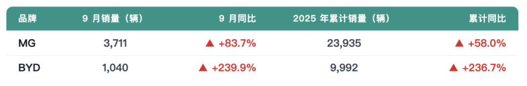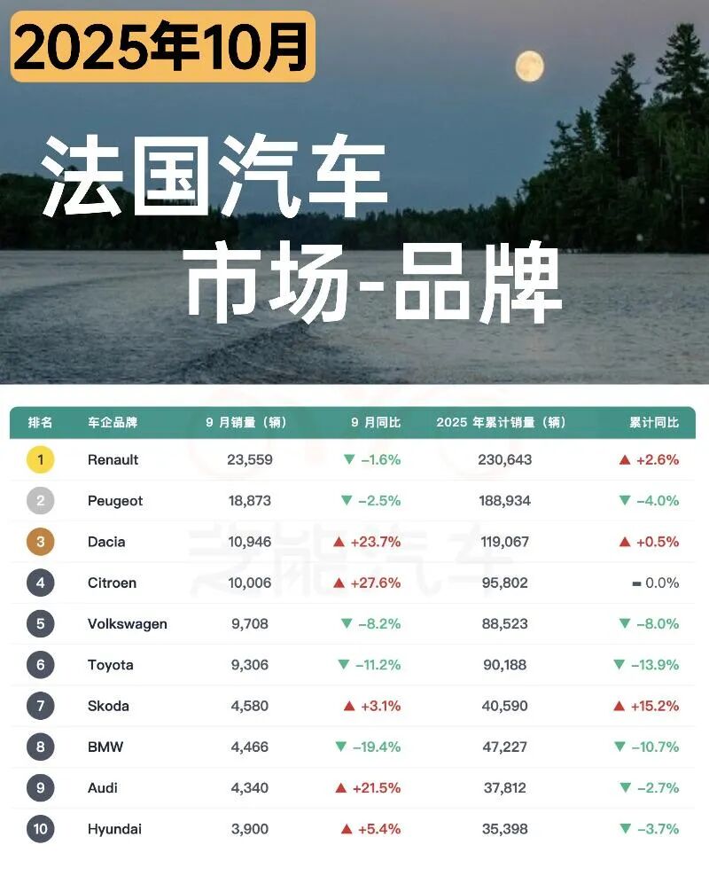 雷诺集团表现强劲,雷诺5单月销量突破纪录;标致和达契亚略显疲软。与此同时,中国品牌在法国的表现持续上升,名爵同比增长近九成,比亚迪增幅超过120%。