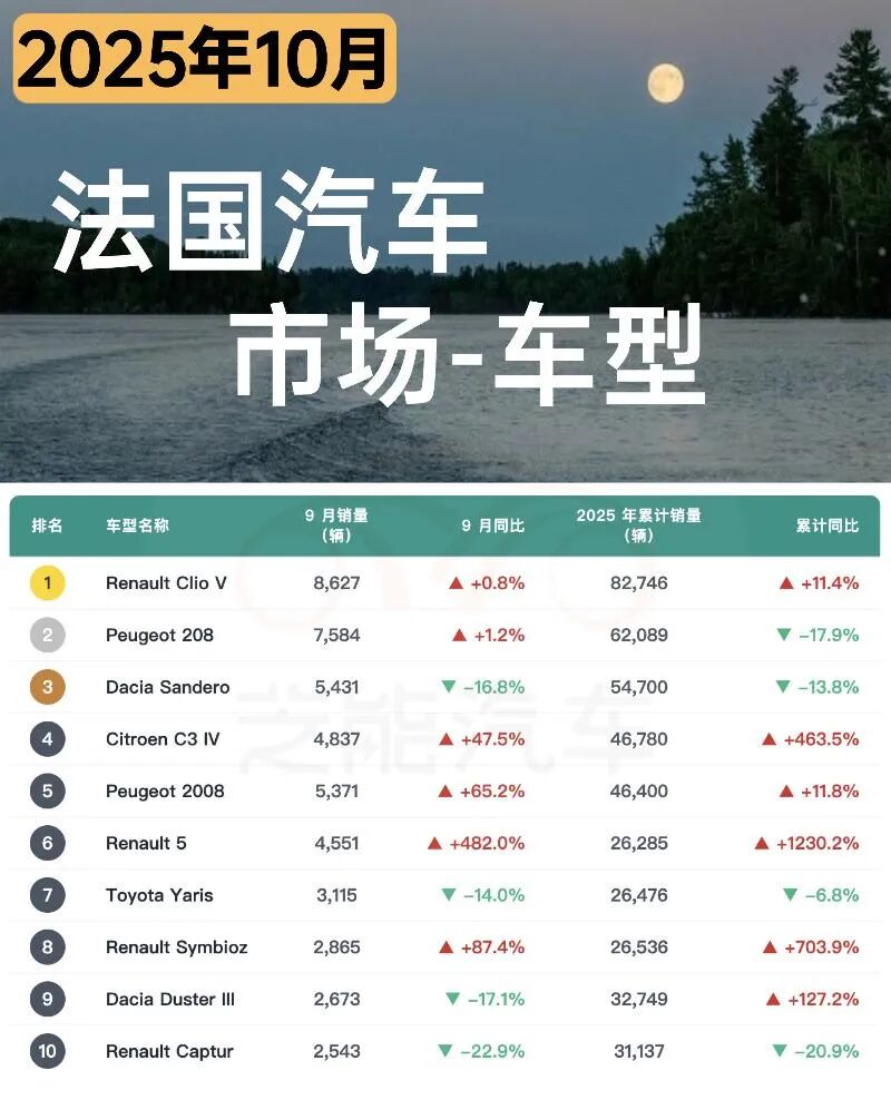 ◎雷诺5以4,551辆跃升至第六位,单月市占率3.3%,刷新历史纪录,成为法国本土市场电动车普及的重要象征;