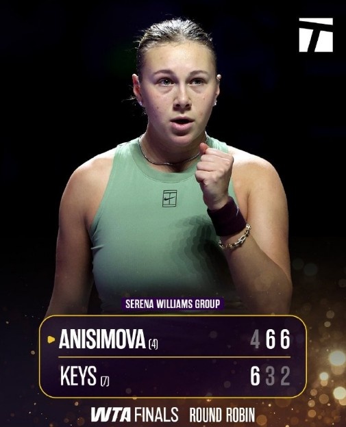 直播吧11月4日讯WTA利雅得年终总决赛单打小威廉姆斯组美国德比,4号种子阿尼西莫娃以4-66-36-2逆转7号种子凯斯,取得总决赛首胜。