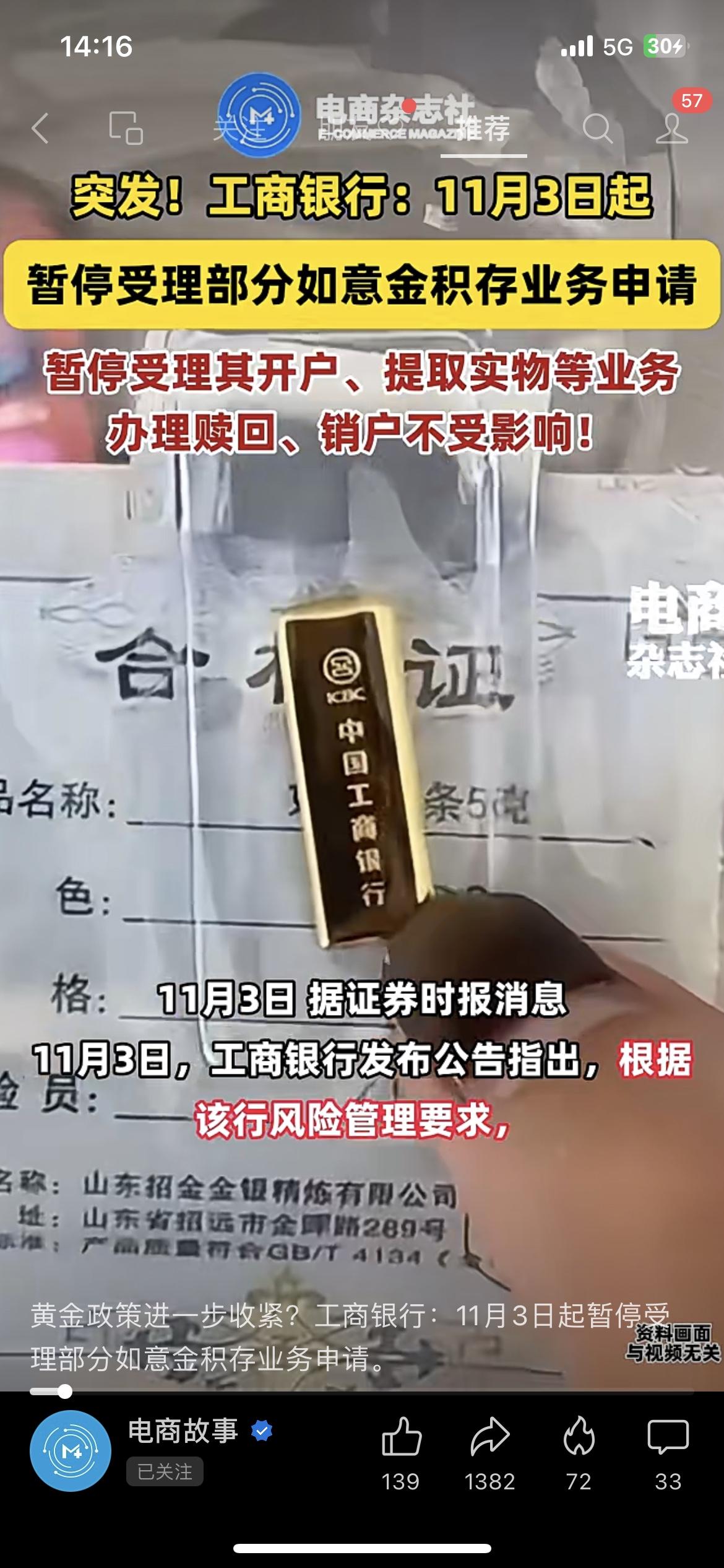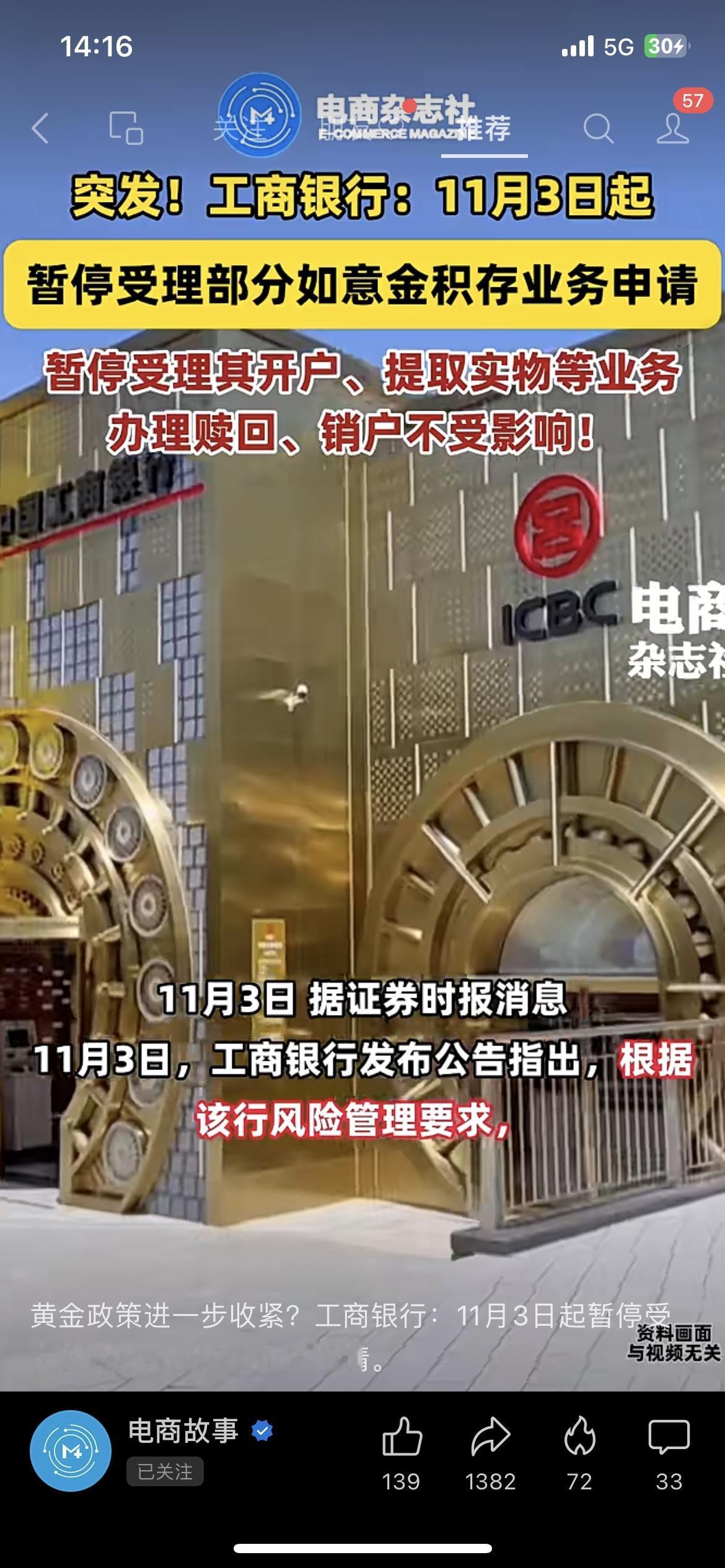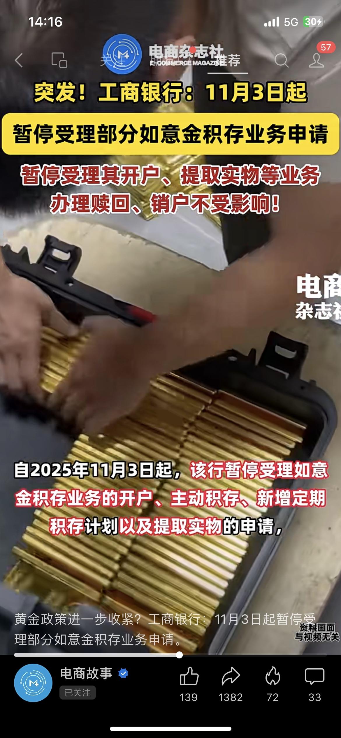 金价疯得离谱!上午928下午1200,工行突然停业务:这是要“抢不到黄金”了? 今天黄金圈直接乱成粥了! 先看这价格:早上刷到投资金条才928一克,下午再看直接飙到1200+!比金项链金镯子都贵!有网友吐槽:“我上午刚犹豫没下单,下午直接涨了200多——这是坐火箭上天了?” 更突然的是银行这波操作:工行今天突然官宣,从11月3日起,暂停“如意金积存”的开户、提实物这些业务,就留了“赎回、销户”的口子。不少人直接慌了:“这是要收紧黄金业务?以后想买实物金是不是更难了?” 不过别慌!业内人说清楚了:这波只针对“投资类黄金”,咱们普通老百姓买金戒指、金手镯戴的,完全不受影响哈! 你们最近有买黄金的吗?这价格涨成这样,敢下手不? 金价行情