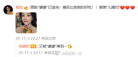 蒋欣:“原版“婆婆”已造完!确实比我做的好吃!!谢谢“儿媳妇”[心][心][心] ”