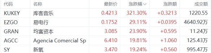 格隆汇11月4日|中概股收盘涨幅前五的个股为:库客音乐涨321.3%,易电行涨29.11%,均富资本涨23.9%,AgenciaComercialSp涨19.81%,新氧涨19.23%。(格隆汇)