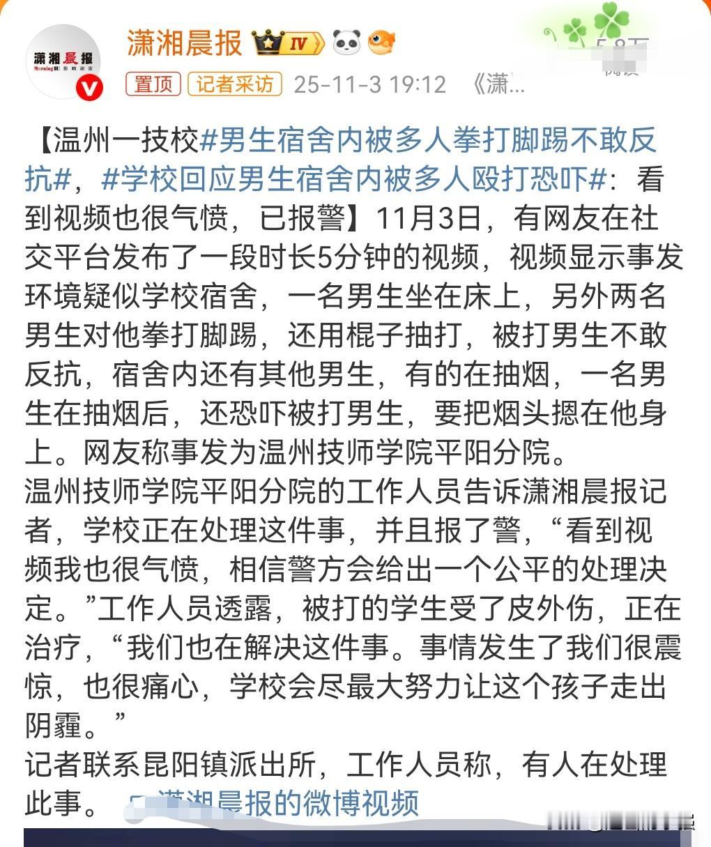 真的是太丧心病狂了,年纪轻轻竟然在宿舍里殴打别人。 这真是无法无天啊!这样的人不严惩的话,那简直是对法律的亵渎。 必须要让打人者受到惩罚。 11月3日有网友发布视频,男生宿舍内被多人拳打脚踢不敢反抗。 这心理阴影实在是太大了,被别人打真的是很耻辱的一件事情。 一定要严惩这几个打人的,最好是开除拘留。