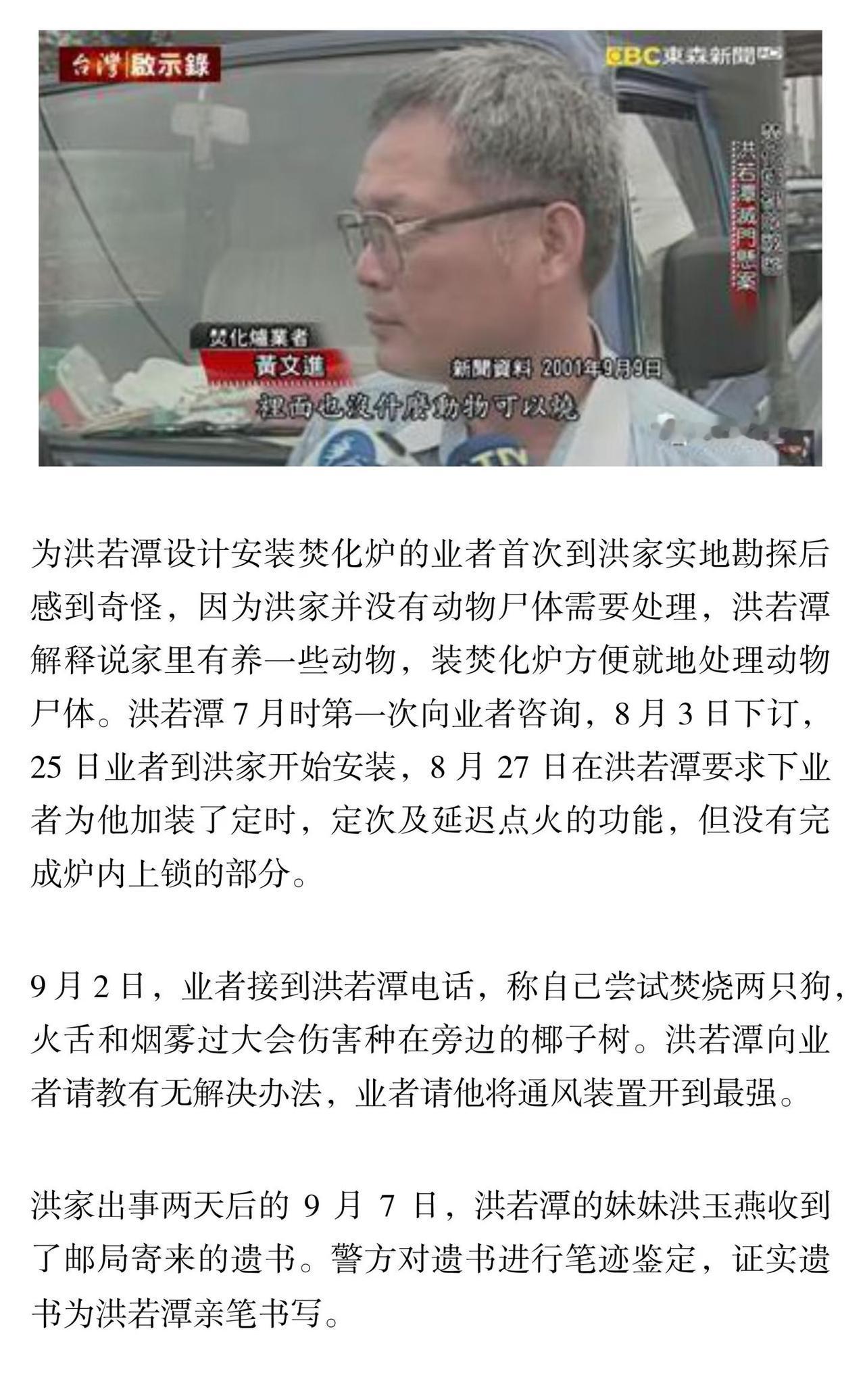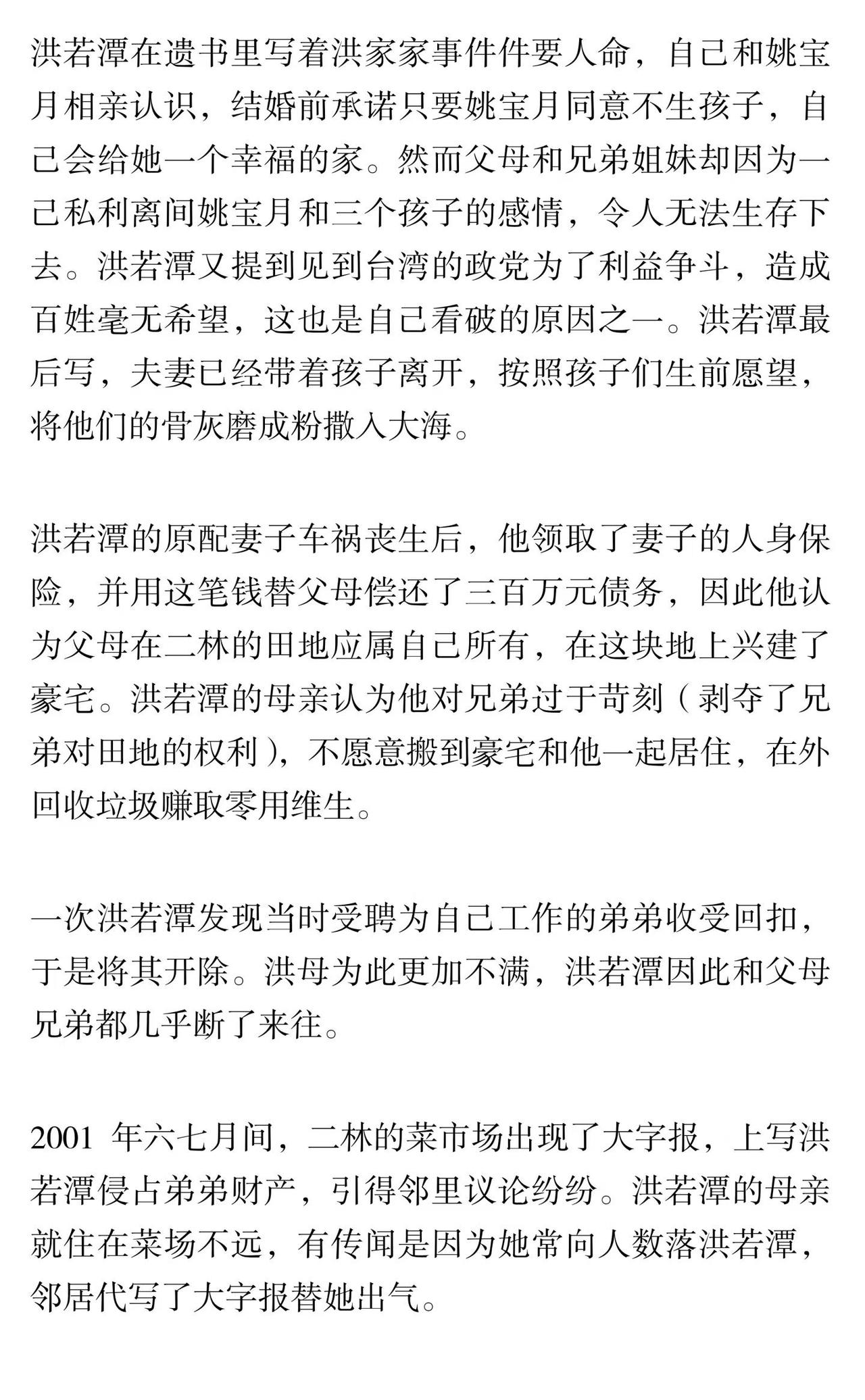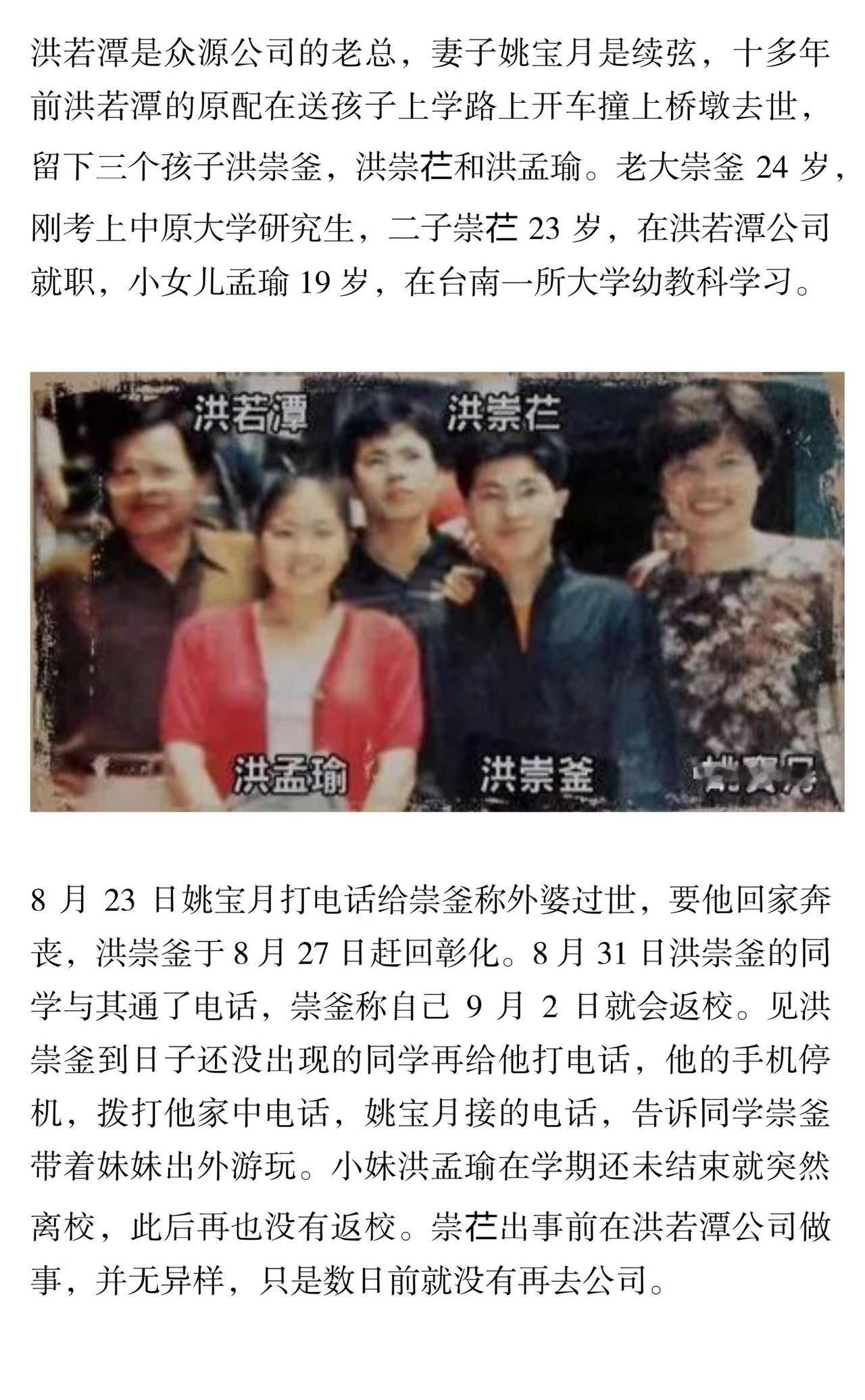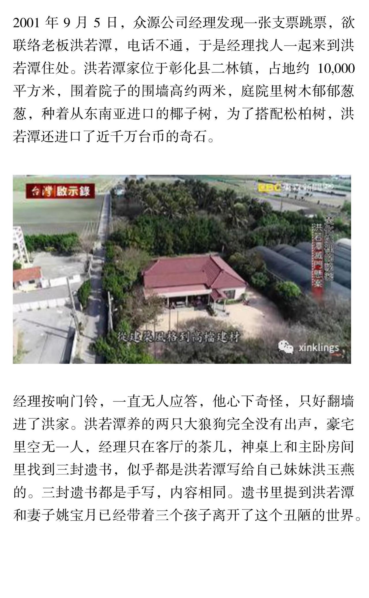 洪若潭 2001年9月5日,众源公司经理发现一张支票跳票,欲联络老板洪若潭,电话不通,于是经理找人一起来到位于彰化县二林镇的洪若潭住处。