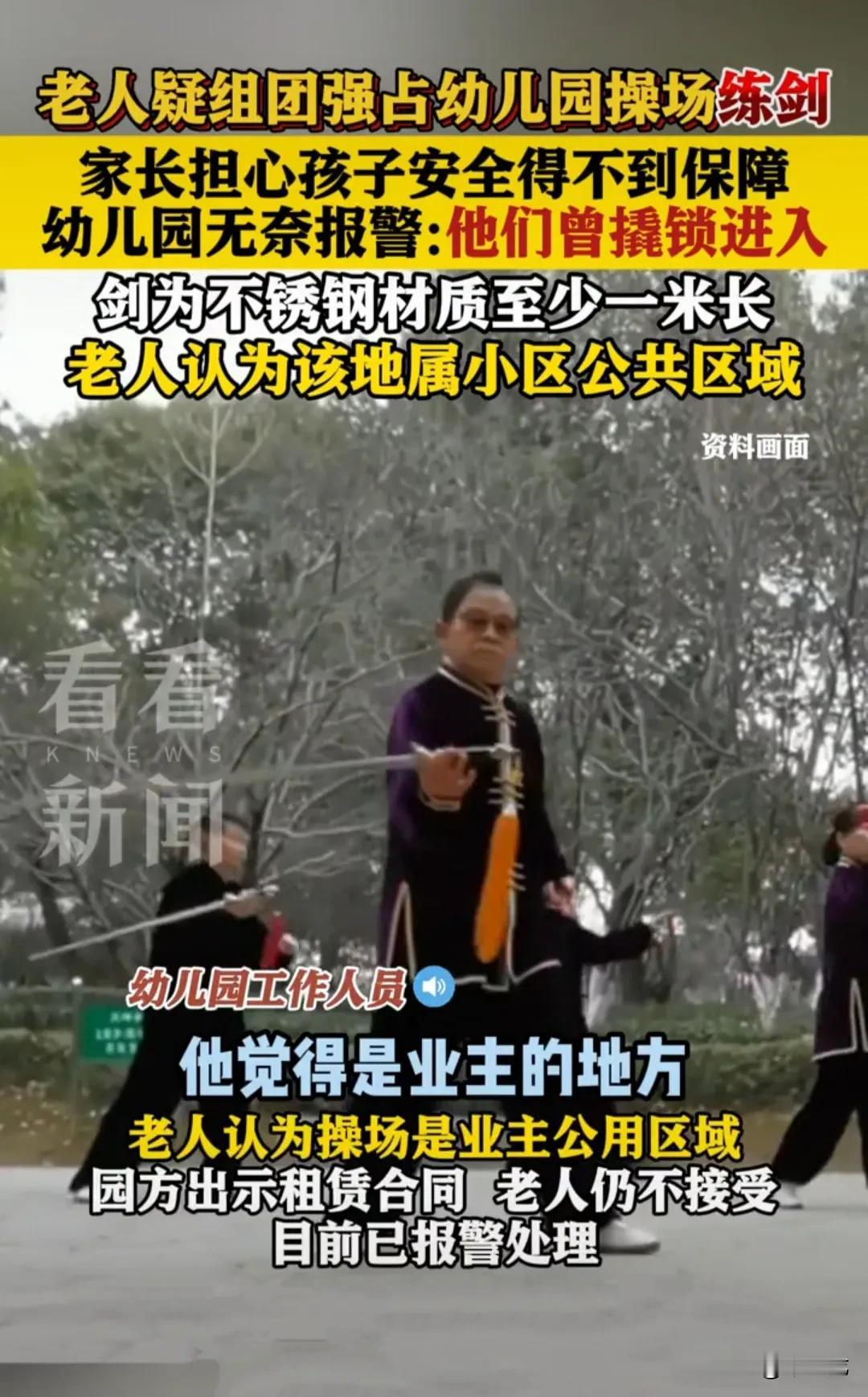 老人清晨强行撬开幼儿园门锁,进入幼儿园操场练剑,直到早上8:30,幼儿入园时都未