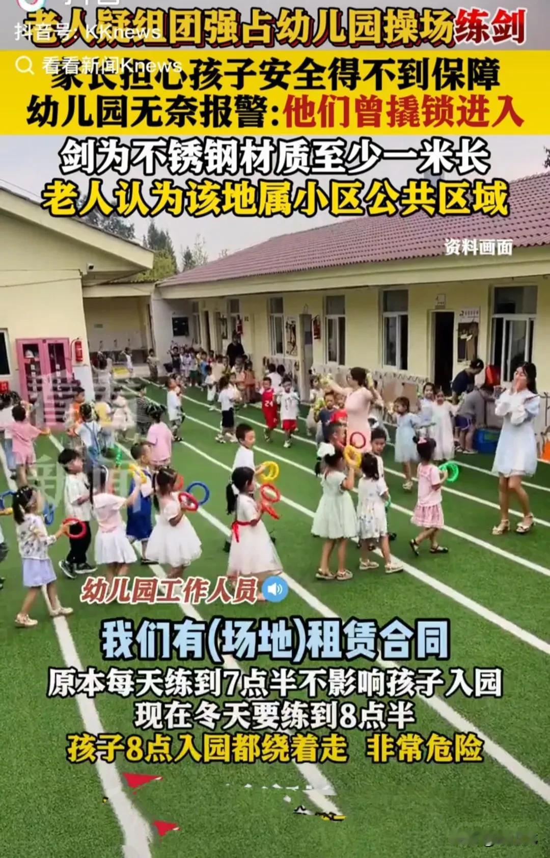 老人清晨强行撬开幼儿园门锁,进入幼儿园操场练剑,直到早上8:30,幼儿入园时都未结束。 老人挥舞的不锈钢刀剑至少一米长,明晃晃的刀剑一耍开,占据大片区域,小朋友又爱跑爱跳,极易被戳到或擦伤。 这种情况若不改变,对幼儿的安全存在着极大的隐患。 为什么会发生这种事,主要是老人认为操场是业主公共区域,他们6月份就在此活动,而幼儿园是9月份才开办的,他们不承认幼儿园对操场的所有权。 尽管幼儿园出示了租赁合同,证明他们对操场有所有权,但老人就是不认可。 这起纠纷的焦点在于操场的归属权,这片地到底是不是公共区域,是谁租给幼儿园的,出租之前归属于哪个地方。 出租方,也就是房东,必须出来说清楚。 如果租赁合同合法有效,老人的做法,就构成了寻衅滋事和违反治安管理条例。 居委会工作人员表示,因为这片地归属不明确,现正组织各方协商调解。 其实哪有这么复杂,只要将老人的退休金停发一半,或者直接降到1000元,他们就老实了,矛盾也就没有了。 友友们,你们觉得呢? (素材来源:看看新闻)