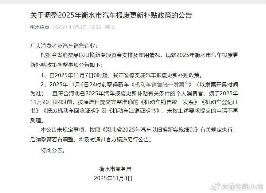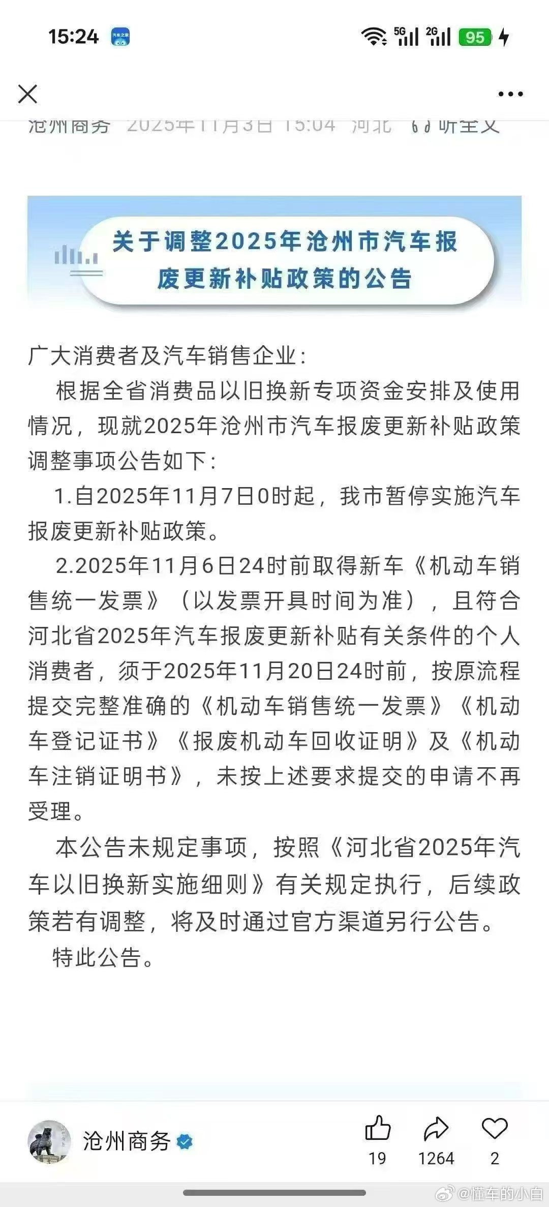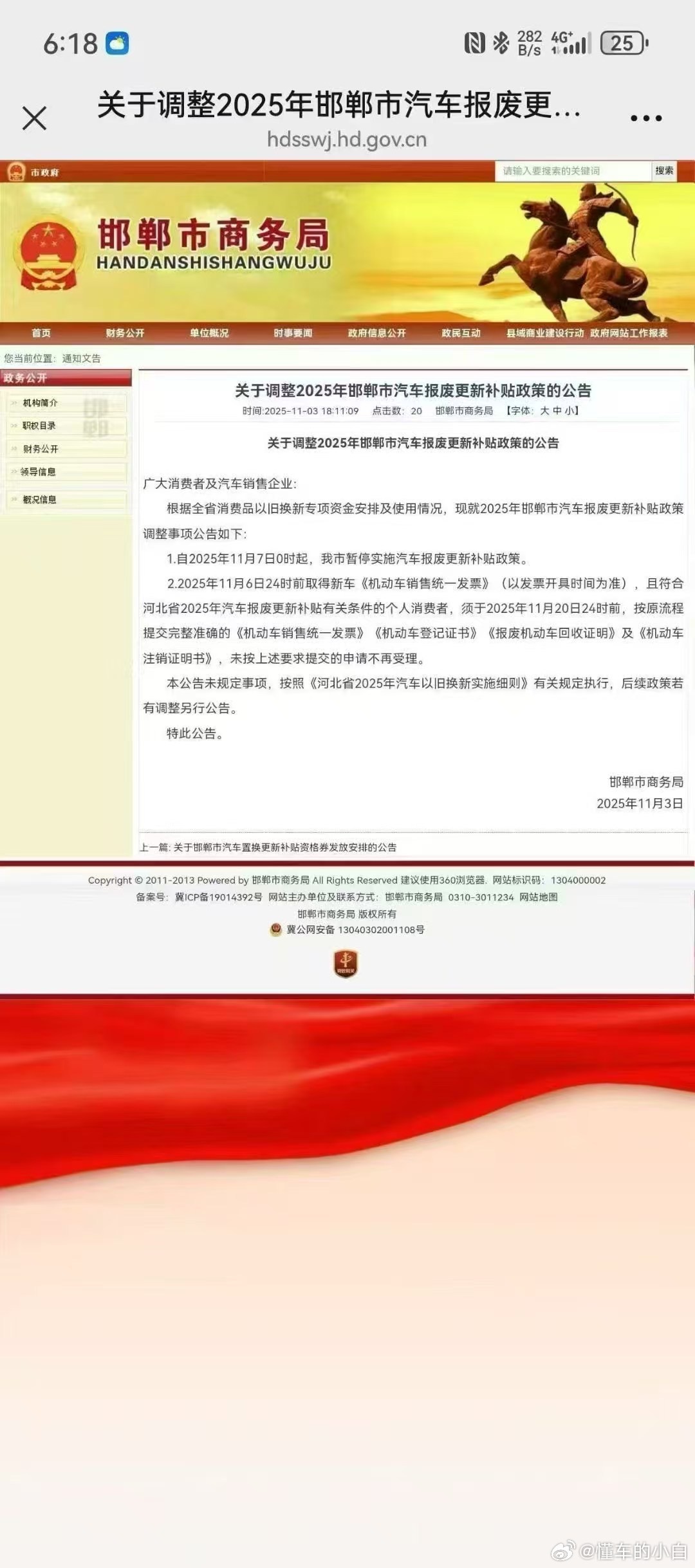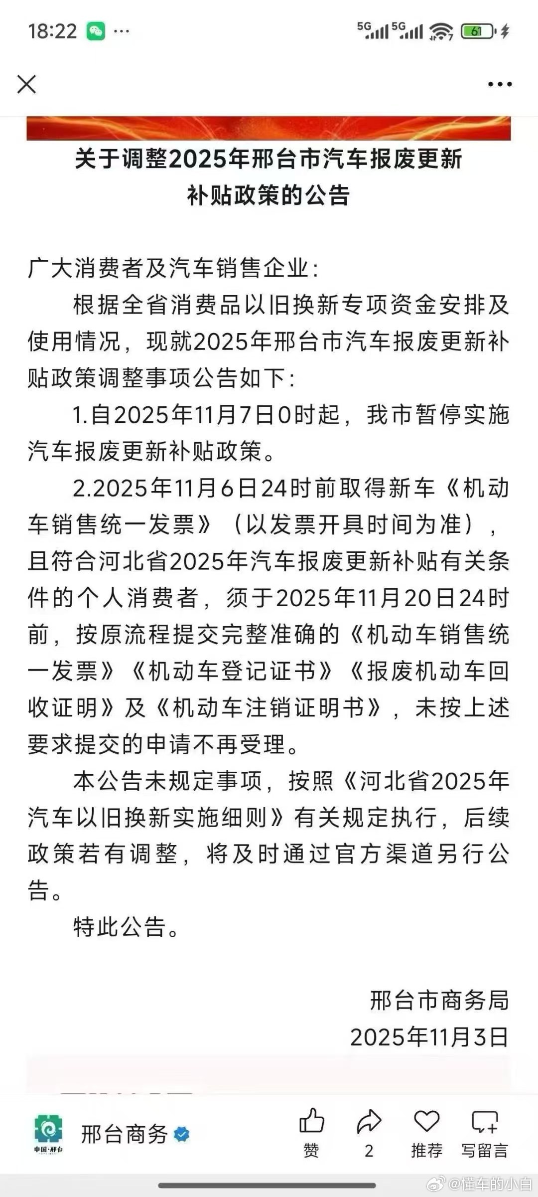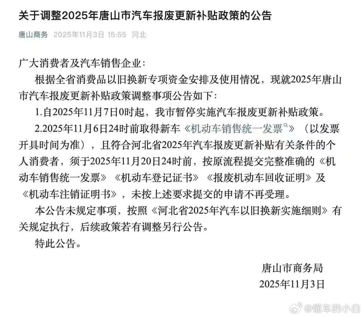 昨又收到了河北 沧州、邢台、唐山、衡水、邯郸报废补贴即将停止的消息。