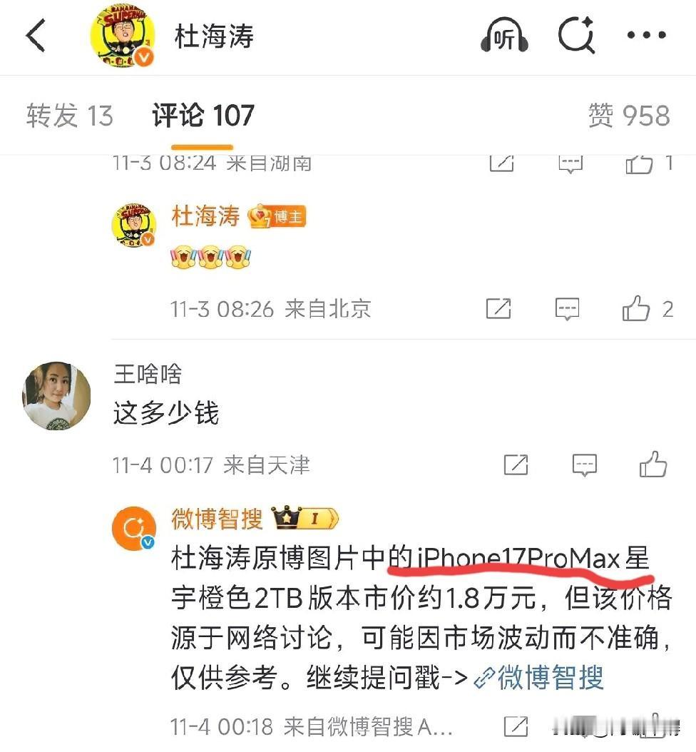 小米 17pro max 太像苹果?AI 回答笑死我了。杜海涛晒了一组小米 17pro max 的图片,大概率也是广告,但是看到评论区的的 AI 回答为一万八的苹果17pro max,看到这里有点绷不住了,难道连 AI 也认为这俩玩意长得很像吗。不过话又说回来了,小米这个后屏可玩性比苹果高了不少,要是你你会买哪一款呢🤔