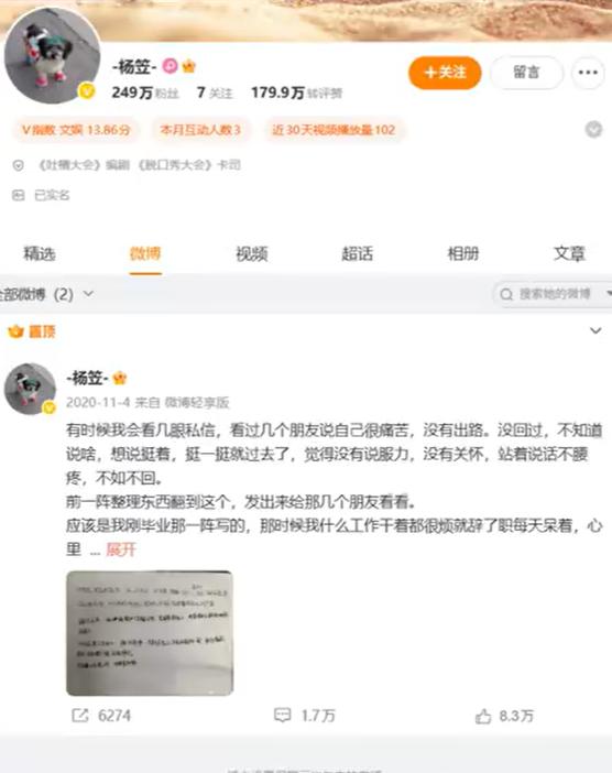 杨笠清空抖音,很意外吗?其实一点都不会,这是迟早的事情,这碗饭不是那么好吃的。 目前,抖音主页显示“暂无作品”,保留32.7万粉丝数与商务合作入口。微博仅保留两条内容,设置为半年可见。 小红书账号未受影响,62.9万粉丝持续更新生活动态与巡演信息,成为主要官方渠道。 杨笠多次声称自己因争议言论遭受长期网络攻击,导致严重失眠与身心疲惫。这其实没有什么好冤枉,既然选择了吃这碗饭就要承受其所带来的后果。若是没有这点承受能力,那就早点离开这个行业,不能既要又要。太双标,可不好。 说真的,普通且自信的男人有什么问题吗?难道普通人就不配拥有自信吗? 当然,现在很多男性也在感谢杨笠,让他们看清楚了极个别的女性,双标不可取。 健康的男女关系是相互成长,而不是贬低对方,不是将对方视为自己的成功的垫脚石,亦或者提款机。 至于杨笠,无论是告别过去还是逃避,这都是她索要承受的,既然选择了这条路,那后果就要承担,不能什么好处都一个人占了。做人不能双标。