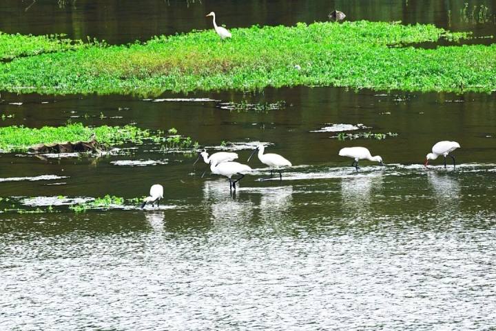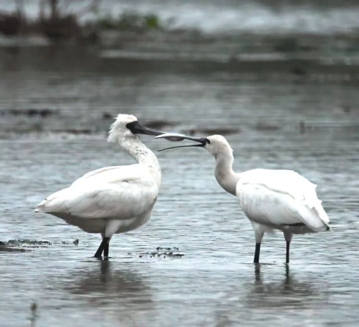 青山湖解锁了候鸟越冬的生态图景,近日迎来黑脸琵鹭、白琵鹭等珍稀鸟类到访。