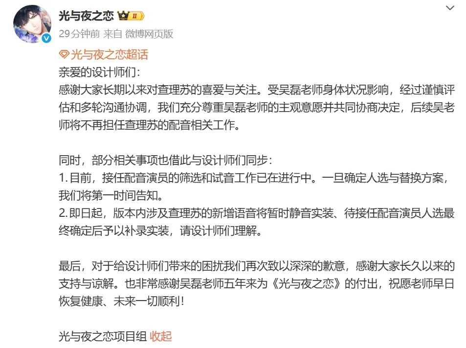 11月4日,配音演员吴磊@食不食毛毛发文:因受健康状况影响,难以继续用最佳状态为查理苏进行配音,经过慎重考虑,以及与《光与夜之恋》项目组进行协商,将从即日起告别《光与夜之恋》的配音工作。