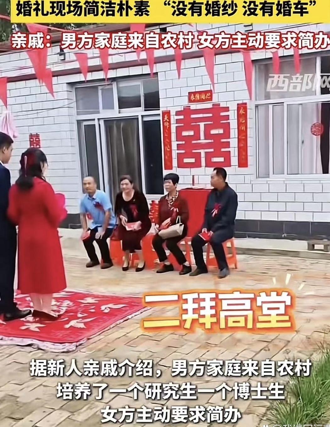河北两个博士生老家简朴的婚礼,没有热闹的酒席,没有收礼,没有吹拉弹唱,没有婚车,就是新郎新娘,双方父母见证,新郎弟弟主持婚礼,拜一拜父母就算完成。这样简单的婚礼不用劳民伤财,弄一堆虚头巴脑的面子工程,在宾客的起哄中喝的晕乎乎,都不知道到底经历了啥。这样挺好,新事新办。 在这个物欲横流、浮华炫耀成为常态的时代,河北这对博士生的简朴婚礼,像一股清流,瞬间冲击了许多人的价值观。没有铺张浪费,没有虚假的热闹,没有迎合所谓的“面子”,只有最纯粹的情感和最真挚的祝福。这种婚礼,或许没有豪华的婚车,没有喧闹的宾客,但它却传递出一种难能可贵的生活态度——真实、简单、纯粹。 试想一下,婚礼本应是两个人携手共度一生的神圣时刻,为何要把它变成一场“面子工程”?大操大办的酒席、繁琐的礼仪、铺天盖地的红包,似乎成了衡量“成功”的标准。而这对博士生用行动告诉我们:真正的幸福,不在于外在的浮华,而在于内心的平静与满足。在他们看来,最重要的,是两颗心的相守,是父母的祝福,是彼此的承诺。 这场简单的婚礼,或许也让我们反思:我们到底在追求什么?是虚荣的面子,还是内心的宁静?在追逐物质的同时,是否忽略了最基本的幸福感?其实,幸福很简单,就是有一个人愿意陪你走过平凡的日子,有父母的祝福,有彼此的真心。这种幸福,远比那些浮夸的场面更持久、更温暖。 更令人欣慰的是,这样的婚礼不但节省了成本,更传递了一种绿色、环保的生活理念。我们常说“节约光荣,浪费可耻”,但在实际生活中,却难以做到。或许,这样的婚礼能启发更多年轻人,重新审视“婚礼”的意义——不是为了炫耀,而是为了见证彼此的承诺,表达最纯粹的爱。 当然,也有人会说:“这样的婚礼太简单,没有气氛。”但难道气氛一定要靠喧闹和繁华来制造吗?真情实感,才是最动人的“气氛”。当新郎新娘在父母的见证下,简单而庄重地拜一拜,那个瞬间,所有的浮华都变得不重要。那一刻,幸福就在心中绽放。 这对博士生的婚礼,像一面镜子,映照出我们对生活的态度。我们是否还记得,最初的梦想和对幸福的定义?是否还能在繁忙的生活中,找到属于自己的那份纯粹?或许,生活的真谛,就是回归简单,回归初心。 他们用行动告诉我们:幸福,不在于外在的炫耀,而在于内心的充实。或许,未来的日子里,我们都可以学会用更平和、更真诚的心态去面对生活中的每一个细节。因为,最美的幸福,往往藏在那些简单、真实的瞬间里。 所以,让我们为这对博士生的勇气和智慧点赞,也希望更多的人能从中得到启示:简单,不代表平庸;真诚,才是最打动人心的力量。或许,下一次的婚礼,我们可以少一些浮华,多一些温暖,让幸福的种子在心中生根发芽。 这,不正是我们每个人都在追寻的幸福模样吗? 博士生的婚礼 结婚婚礼