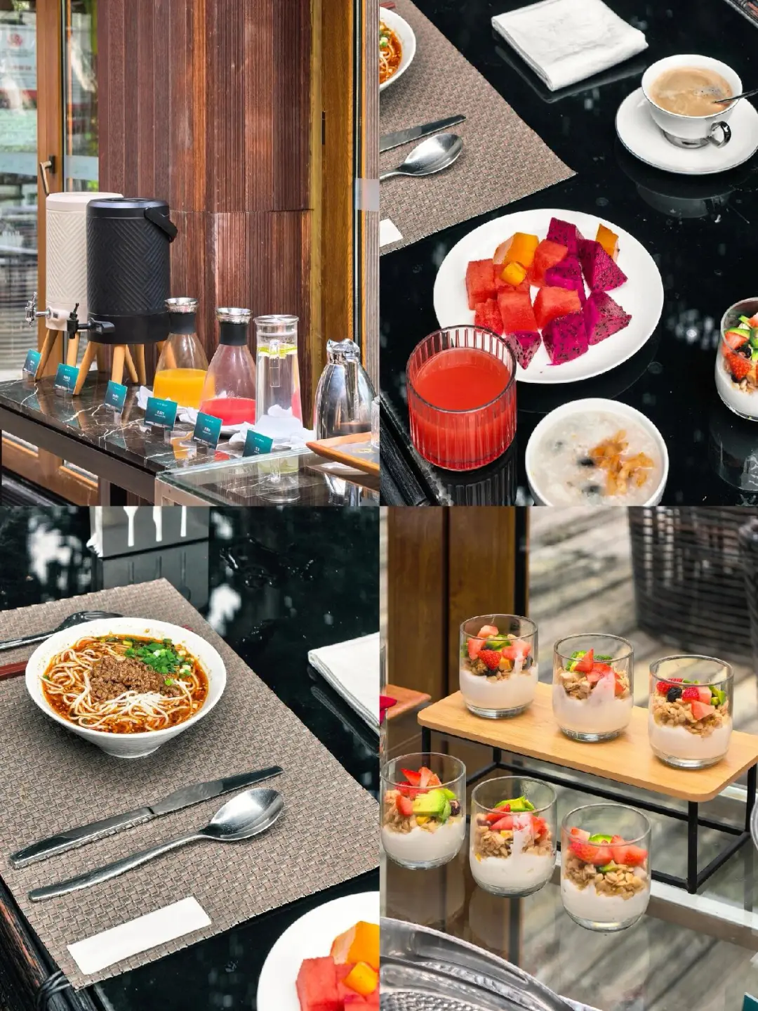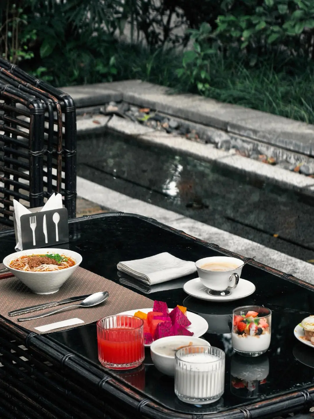 首先是早餐,可以选在融汇国际吃还是泉别院吃。前者品种比较丰富,后者环境比较安静私密性较好。这次是在泉别院用的早餐,在大唐旁边,户外区很舒服,强烈推荐杂酱面。