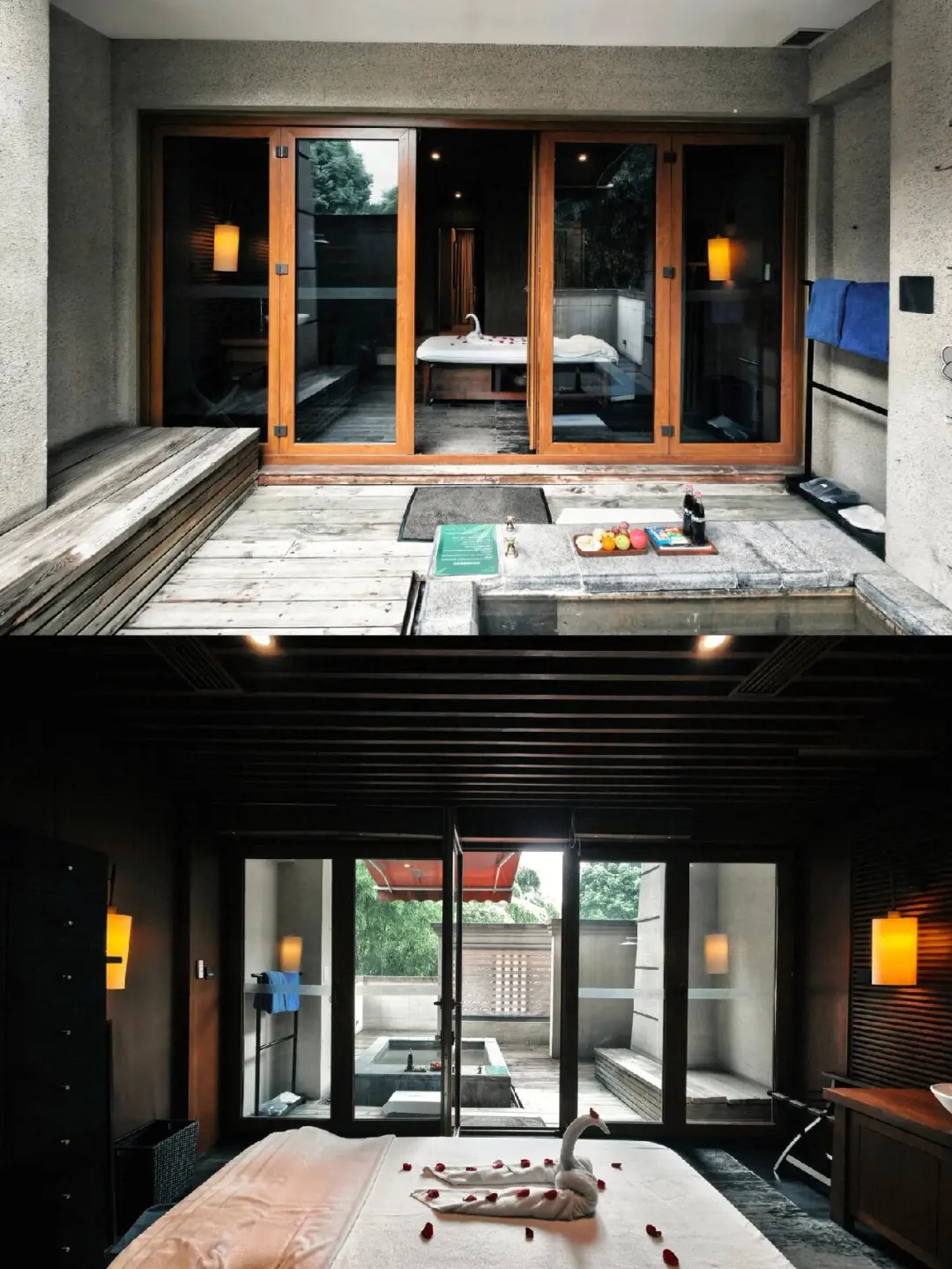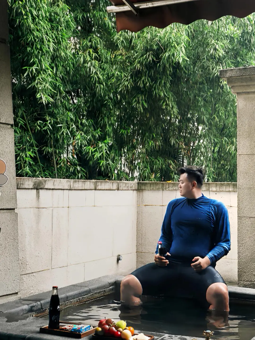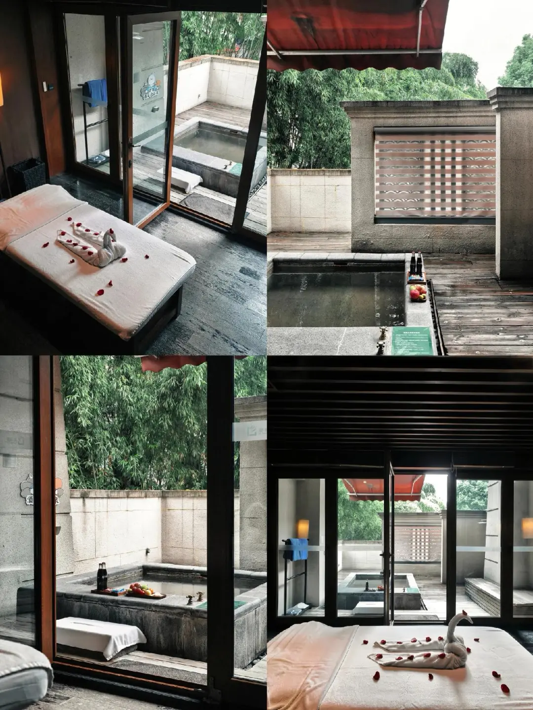 户外是温泉泡池,配有户外的淋浴区。作为重庆传统的“中温泉”,这家是真温泉水入户,并可以选择养生和精油的泡汤包,除了入住时在房间里放好的一个,每次入住还可以享受一次更换服务。