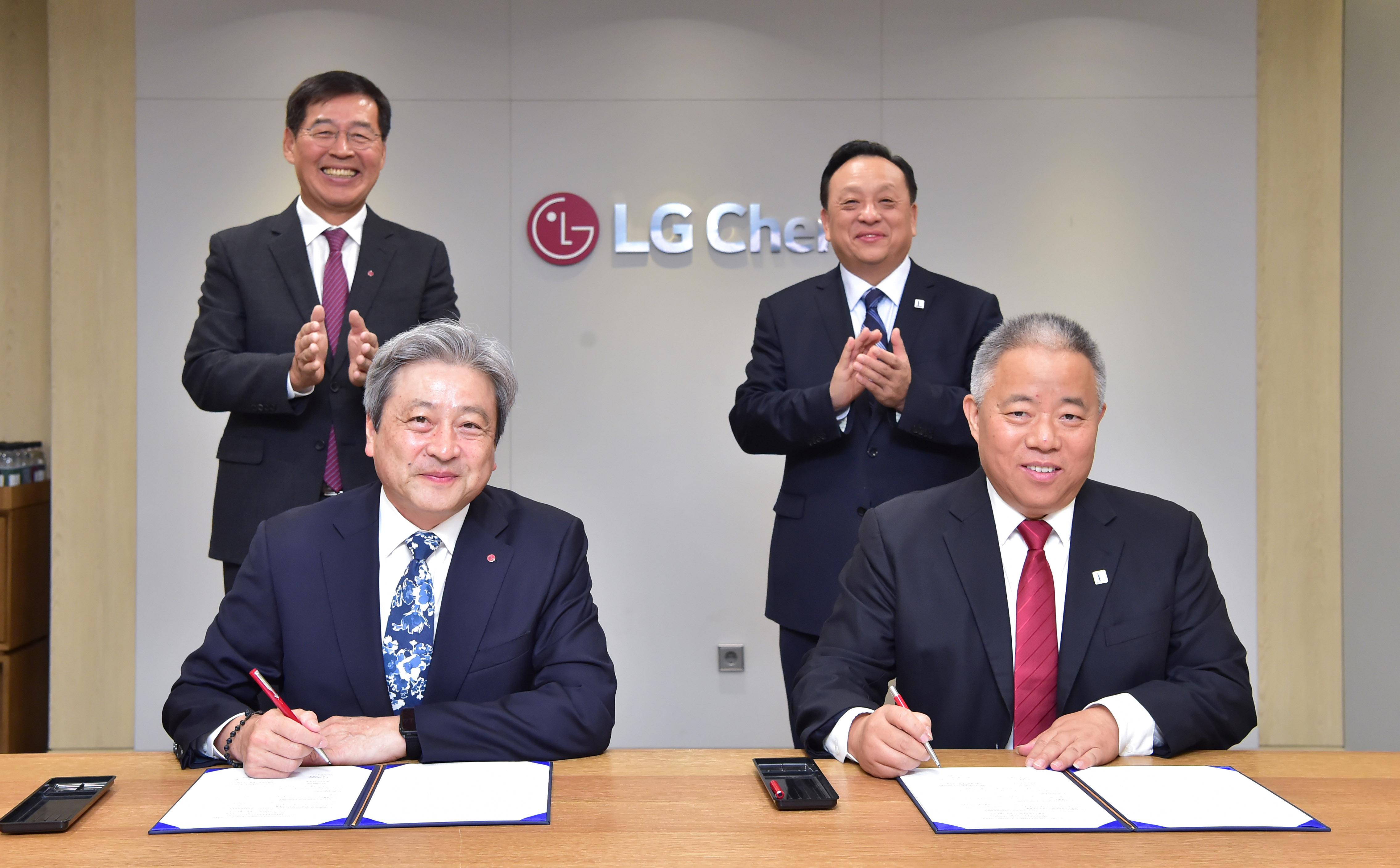 中国石化董事长侯启军、副总经理万涛,LG化学首席执行官辛学喆出席签约仪式。中国石化科技部总经理卞凤鸣和LG化学首席技术官李钟求代表双方签约。