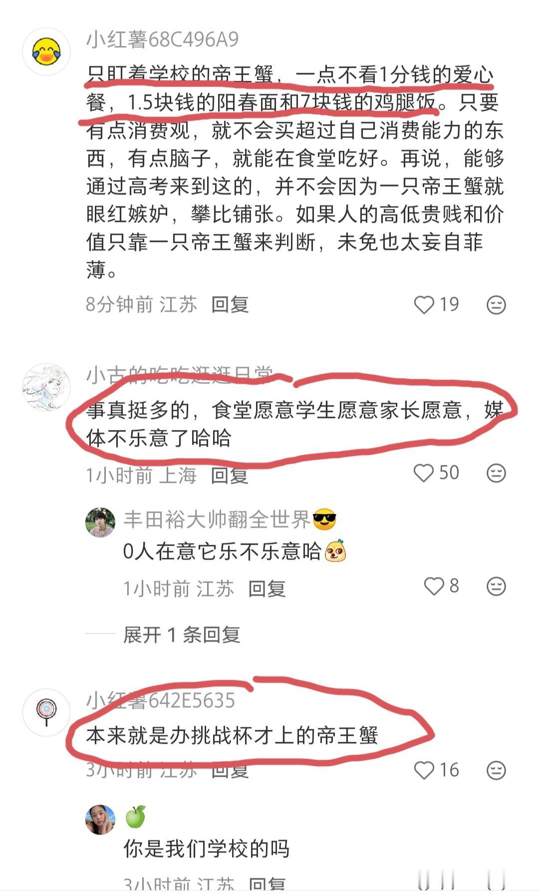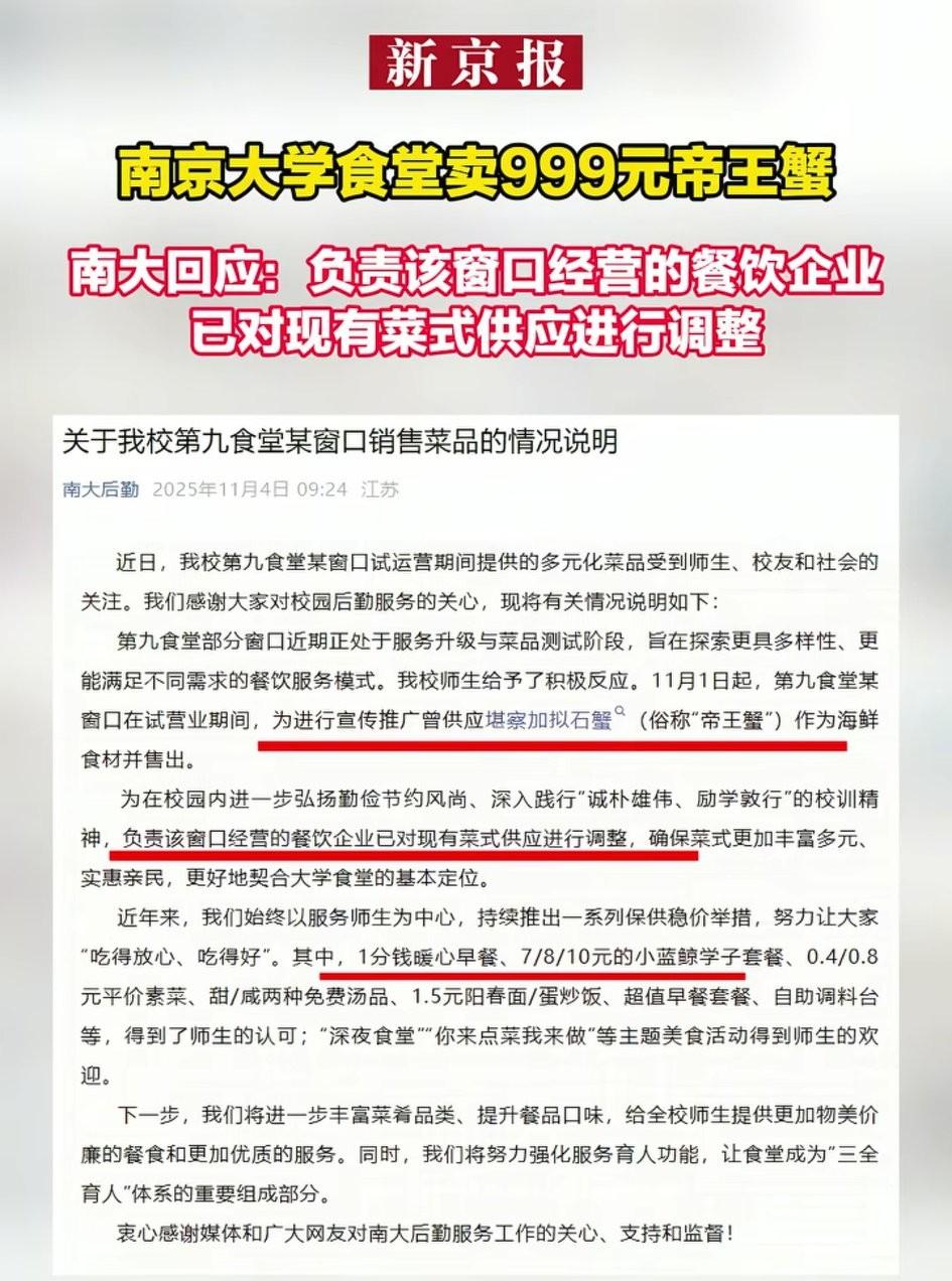 新京报发文爆料“南京大学食堂开卖999元帝王蟹”,并陈诉自己的观点:帝王蟹不应该进入学校食堂…… 此文一出,却遭到网上一片吐槽的声音: “学校食堂愿意学生愿意家长愿意,媒体不乐意了”。 “只盯着学校的帝王蟹,一点不看1分钱的爱心餐,1.5块钱的阳春面和7块钱的鸡腿饭”。 不过,评论区也有少部分网友认为新京报批评的对,他们认为:学校就是教书育人的地方,不能成为鼓励学生奢靡浪费、助长学生攀比心理的场所。 这个事情对与不对大家每个人心里都有一杆秤。但我觉得新京报发这篇文章并没有错,他就是把社会上比较新鲜的事物报道出来,并附上了自己的观点,这何错之有。那些评论区骂骂咧咧的,可能是说到了他们的痛处,动了他们的利益了吧! 大家觉得呢?