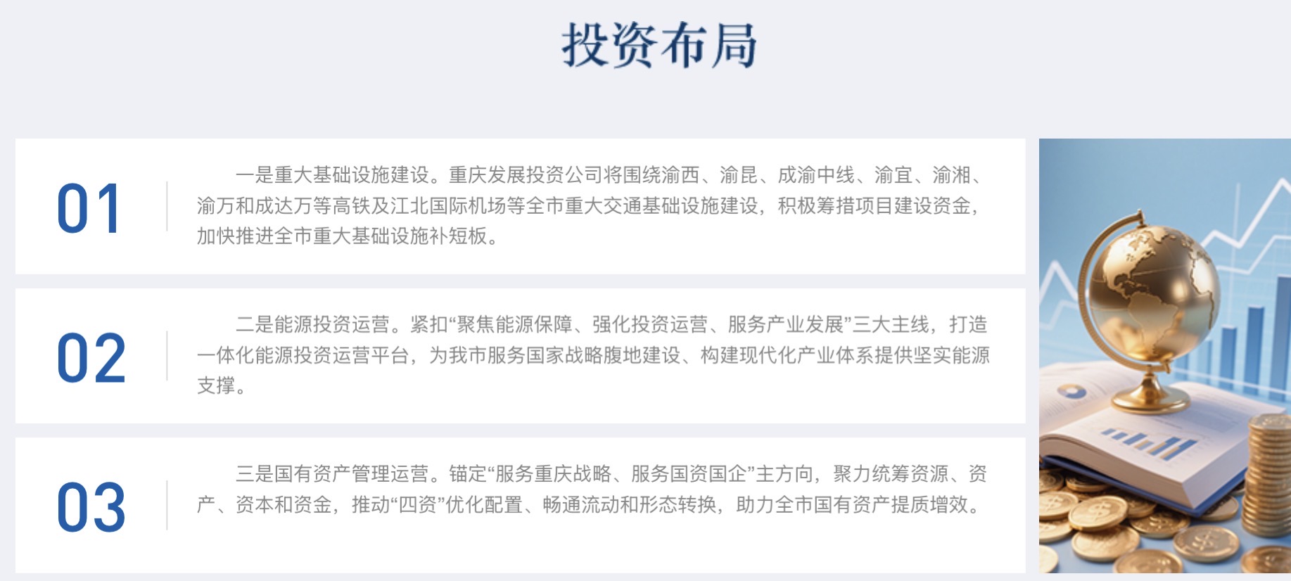 重组后的重庆发展投资公司,将聚焦重大基础设施投融资运营、能源投资运营、国有资产管理运营“三大主业”,强化铁路、机场等重大基础设施投资保障功能,充分发挥能源投资与资产盘活功能,做好资本进退流转,为重大基础设施投融资提供保障。