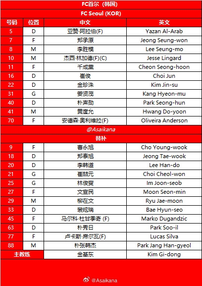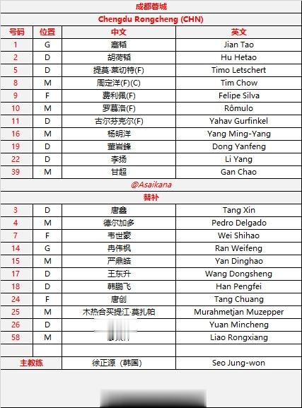 直播吧11月04日讯北京时间18:00,亚冠精英东亚区第4轮,成都蓉城客场挑战首尔FC。赛前,双方首发出炉。