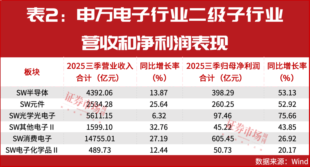 据Wind统计,截至11月3日,在申万电子行业491只电子股中,除了中芯国际和华虹公司推迟发布外,其余489只个股均已披露2025年三季报。整体上,电子行业表现出强劲增长态势。
