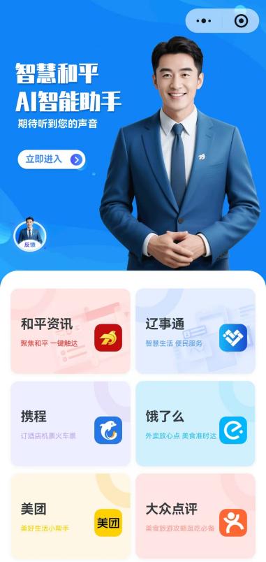作为东北首家实现新闻类小程序集成的智能服务平台,“智慧和平”小程序在原有功能基础上持续迭代升级。目前已整合和平资讯、辽事通、携程、美团、饿了么、大众点评等多元服务载体,搭配专属智能人“和智宣”的AI交互能力,构建起覆盖信息获取、政务办理、生活服务、消费娱乐等的全链条服务体系。市民无需切换多个应用,即可通过一个小程序完成权威新闻阅读、社保查询、政务办理、美食推荐、出行规划、外卖下单等各类需求,实现“一端集成,万事无忧”。