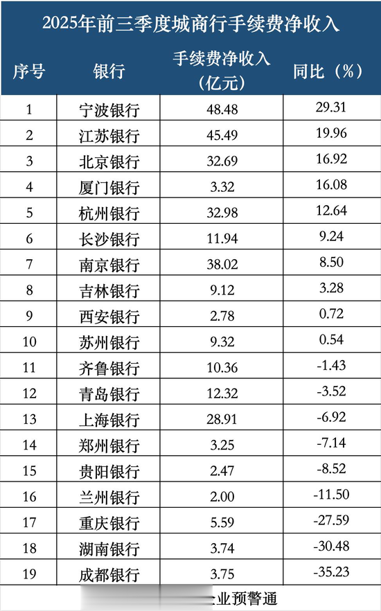 城商行的中收分化极为明显。中收增长强劲的银行中,宁波银行增速接近30%,江苏银行、杭州银行、北京银行、厦门银行的中收增速均超过了10%,显示出头部城商行中收回暖势头明显;中收下滑的银行中,成都银行降幅超30%,重庆银行降幅27%,凸显了中西部区域性银行在经济周期波动面前的脆弱性,不过这些银行中收规模均较小。