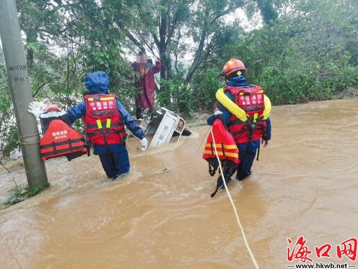 海口网11月4日消息(通讯员王咪记者谢昀惠)11月4日12时30分许,在海口市琼山区大坡镇龙滚塘村,受强降雨影响,当地一处低洼路段积水较深,一辆电动三轮车抛锚被淹,1名中年男子被困道路。海口市消防救援支队指挥中心接警后,立即调派琼山区三门坡镇专职消防救援站1辆消防救援车、6名消防救援人员,携带救生衣、安全绳等装备赶赴现场救援。