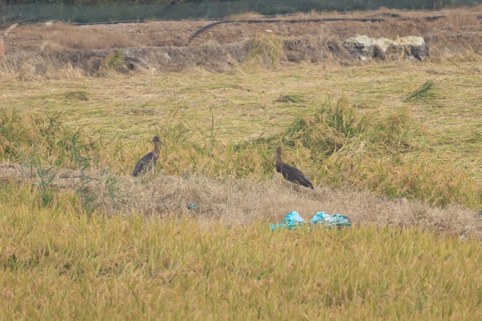 大皖新闻讯11月4日下午两点左右,庐江县白山镇巢湖西岸的白石天河河边稻田里,巢湖生物资源调查团队成员拍摄到两只国家一级重点保护野生动物黑鹳。