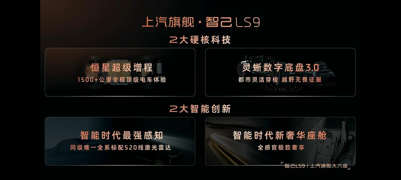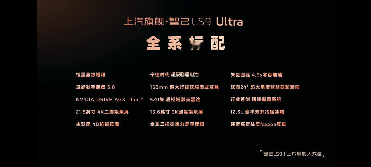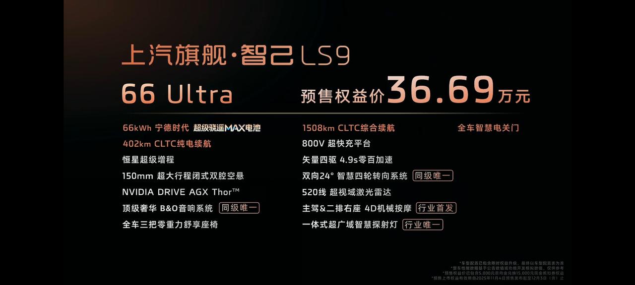 这个大9系走心了,智己LS9预售权益价33.69万起,两种电池版本,赠送和权益非常香,还有跨年购置税兜底1.5万,入门即顶配,没有选困难,今晚24点前下定有神秘礼品。新车2大杀手锏,第一个是恒星超级增程,1.5T可变涡轮截面增程器,66度电+800V,纯电续航402km,综合续航1508km,油电综合折算能耗百公里2.81L。 第二个是灵蜥数字底盘3.0,解决6座SUV两大城市痛点,晕车和笨重,150mm行程的双腔闭式空悬,双向24度后轮转向,转弯半径4米95,能跑长途能跑城市,还能越野的全能型。另外全线控转向和三电机矢量四驱的旗舰车型也在筹备中,明年1季度就有消息了。 冰箱彩电大沙发自然也不会缺席,全系标配520线激光雷达,大功率的B&O音响,中国车型首次搭载,还有露营+穿越用到的射灯,三零重力座椅,4D机械按摩的“手感”可以线下体验一番,野奢户外套装,长途旅行时您还能跟它洗个热水澡。大面上咱们过了一下,您要是想了解细节和体验,可以关注我们刚刚上新的静态实拍,11月12号上市发布还会有更多惊喜。【来自懂车帝车友圈】