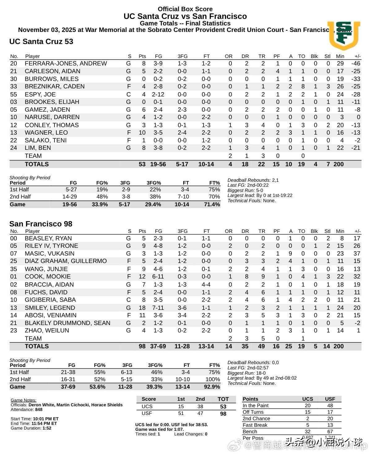 旧金山大学首战!王俊杰9分4篮板!赵维伦4分3助攻 旧金山大学新赛季首战面对D3级别的对手,直接碾压对手,10分钟就击溃了对手,领先20分,最终以98-53大胜对手,中国球员王俊杰首发出场15分钟,6投4中得到9分4篮板1助攻,赵维伦出场14分钟,3投1中得到4分1篮板3助攻1抢断。 王俊杰首发出场,可以看出新赛季王俊杰基本上坐稳了主力,开场教练就把球权交给他连续背身单打得分,由于对手太弱,上半场他打了10分钟,后面分差太大就没上了,下半场王俊杰也只打了5分钟,赵维伦上半场只打了3分钟,一次出手没有得分,但是有两次非常精妙的传球助攻队友得分,下半场随着分差拉大,赵维伦也得到了10分钟的出场时间,赵维伦作为新球员估计还需要适应一下,新赛季王俊杰大概率会是首发,赵维伦也会成为稳定轮换球员。