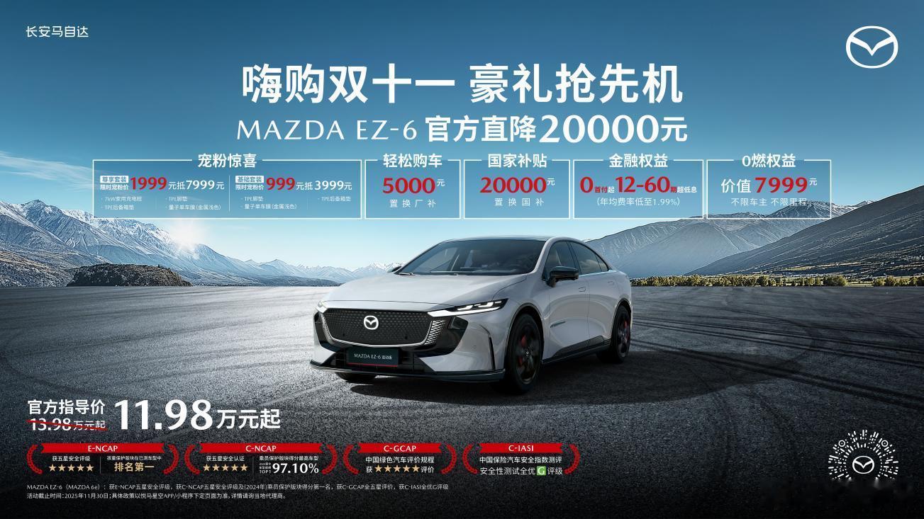 MAZDA EZ-6 官降至11.98万起,作为合资B级新能源轿车,具备双动力与高安全性能。购车可享: