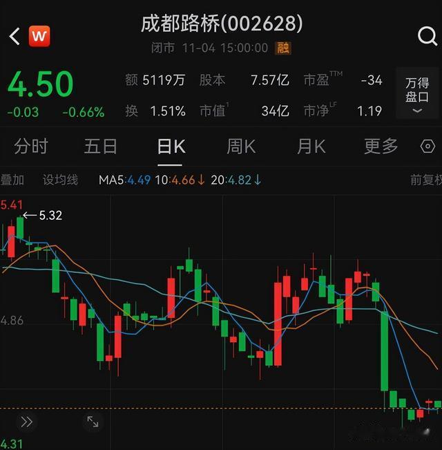 截至11月4日收盘,成都路桥报4.50元/股,跌0.66%,总市值为34.07亿元。