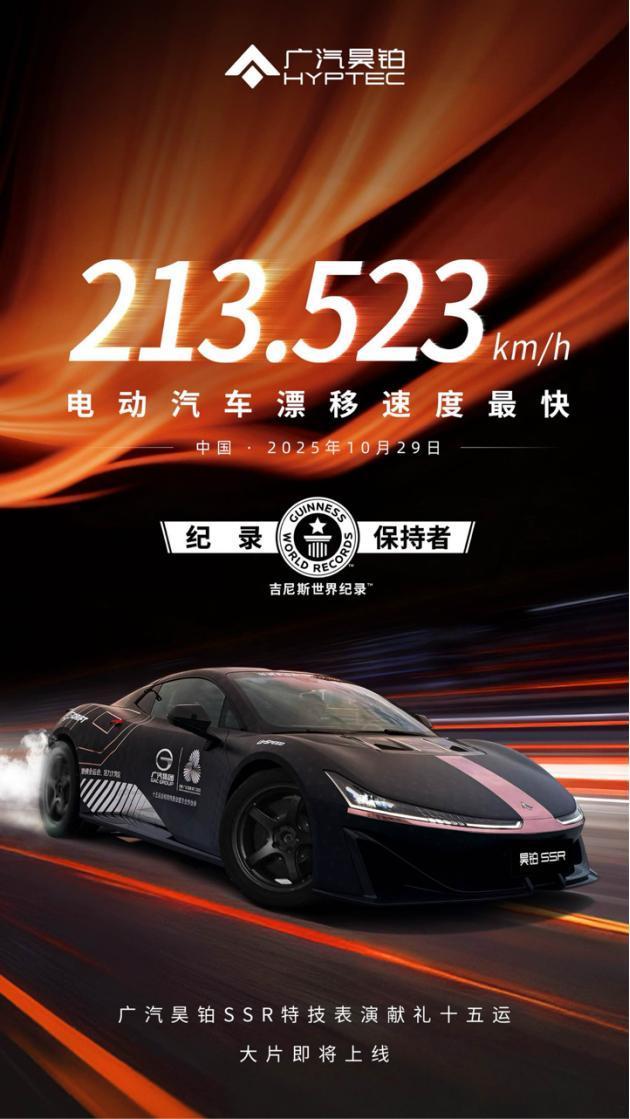 中国超跑新标杆!昊铂SSR刷新纯电车漂移世界纪录,直接飙出213.523km/h的成绩,拿下吉尼斯认证。