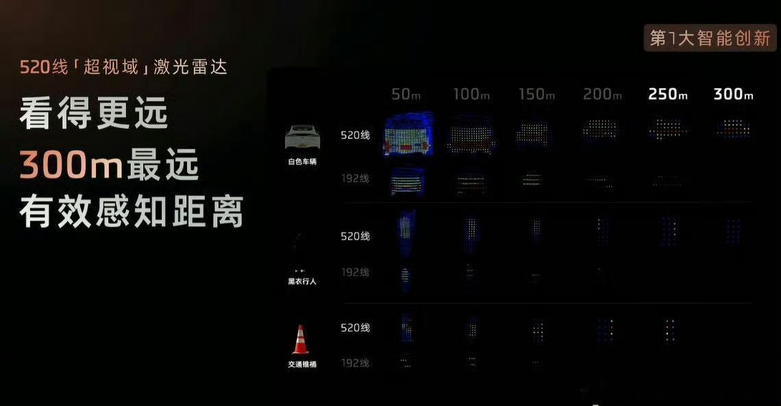 智己LS9搭载了520线激光雷达,最远感知距离是300m,符合 L3 级标准感知能力。大家看对比图,区别很清晰智己ls9智己新能源汽车