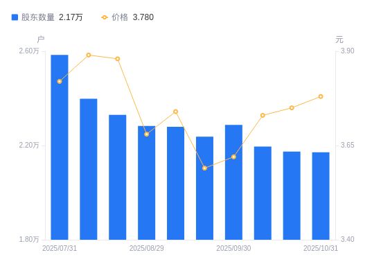 近一年(2024年10月31日至2025年10月31日),扬子新材A股股东户数从2.61万户,减低至2.17万户,降幅16.92%,区间股价上涨22.73%。
